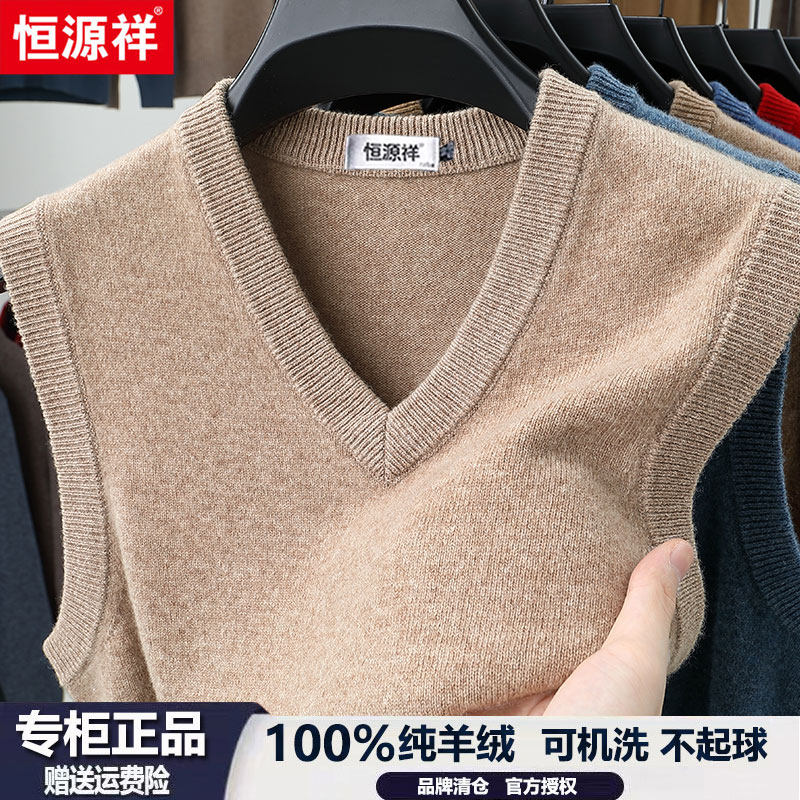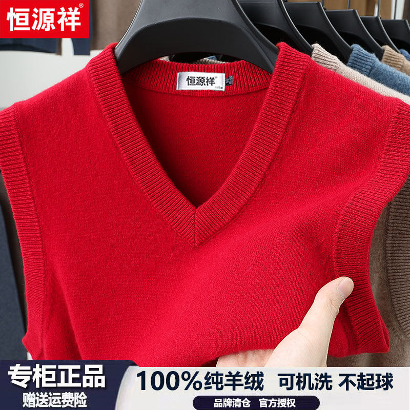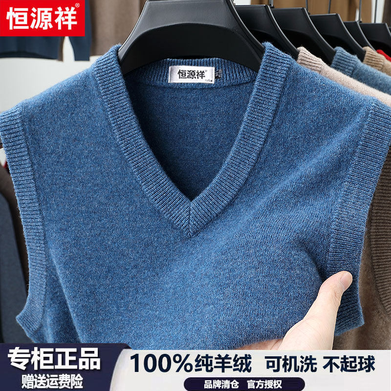 恒源祥100%羊绒背心男冬季新款商务休闲V领加厚无袖坎肩马甲毛衣