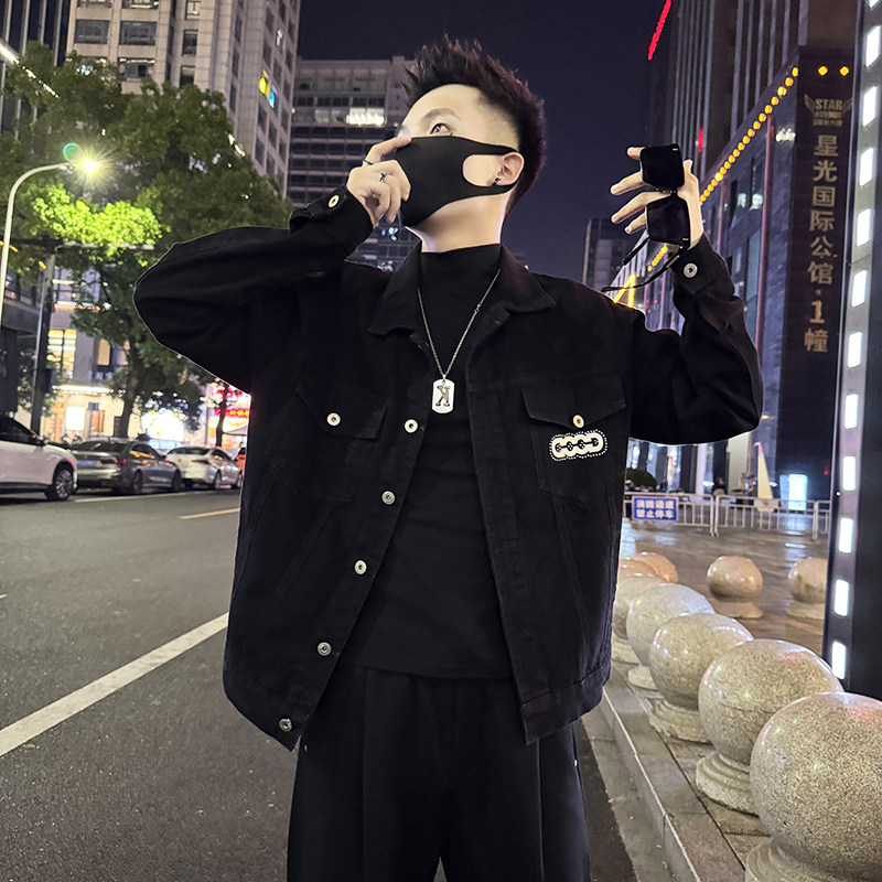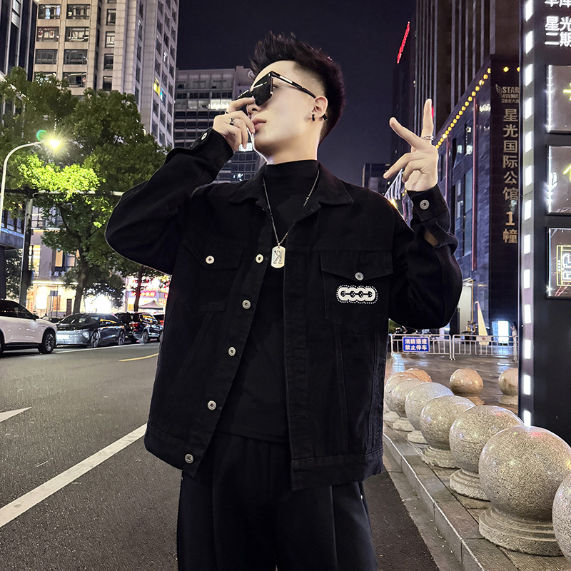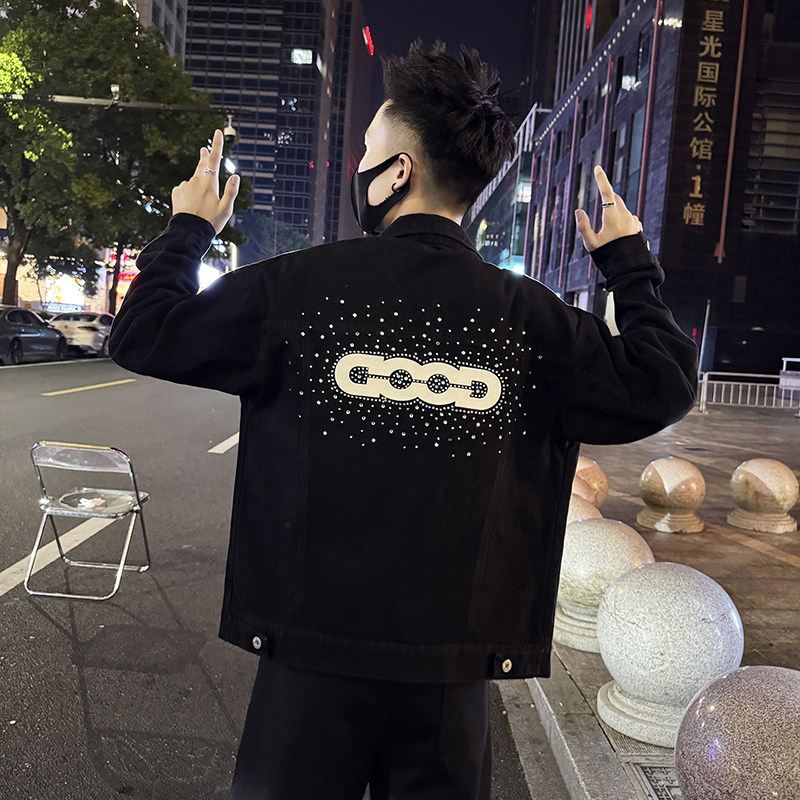 小码男装春秋季新款高街字母烫钻牛仔夹克男S号XS码潮流宽松外套
