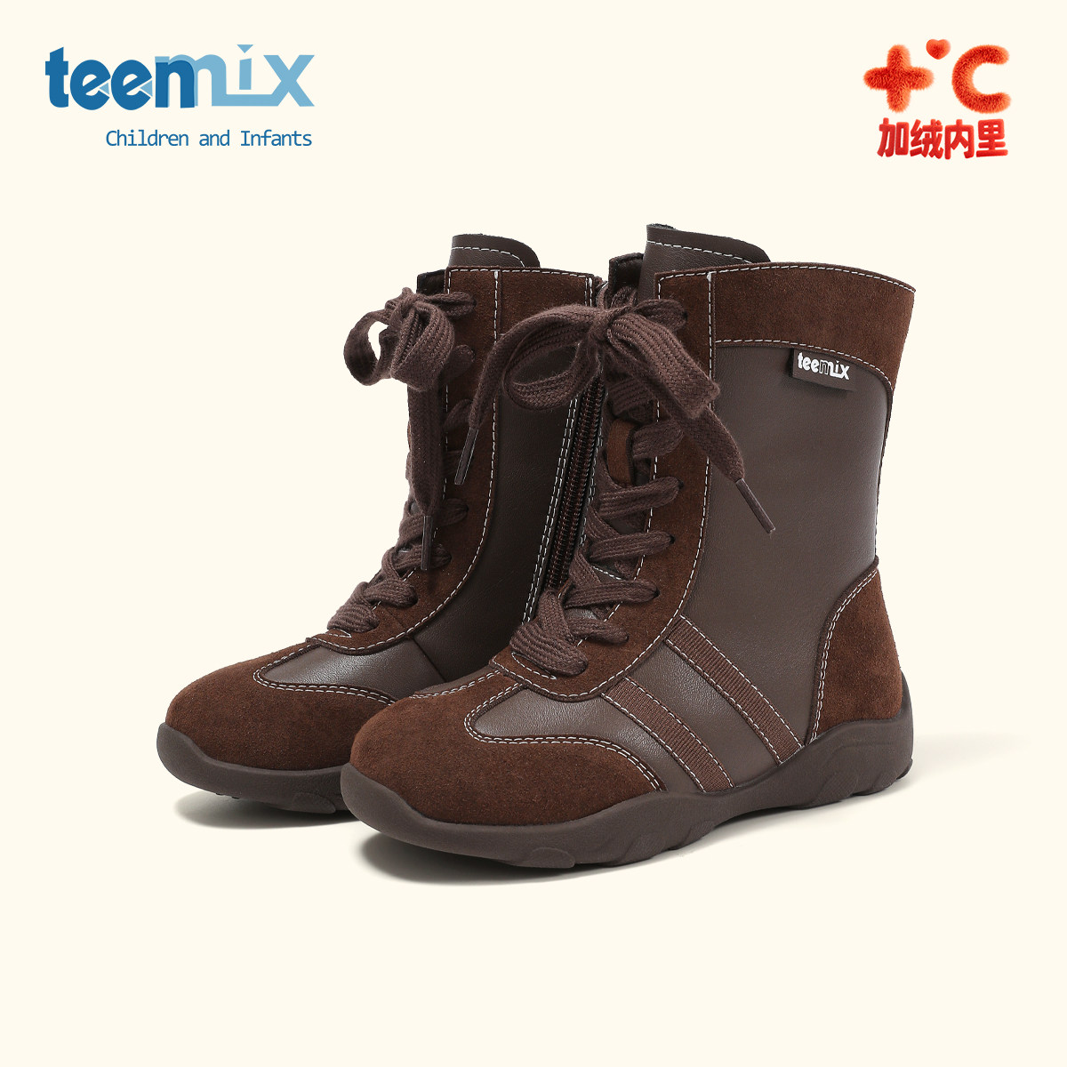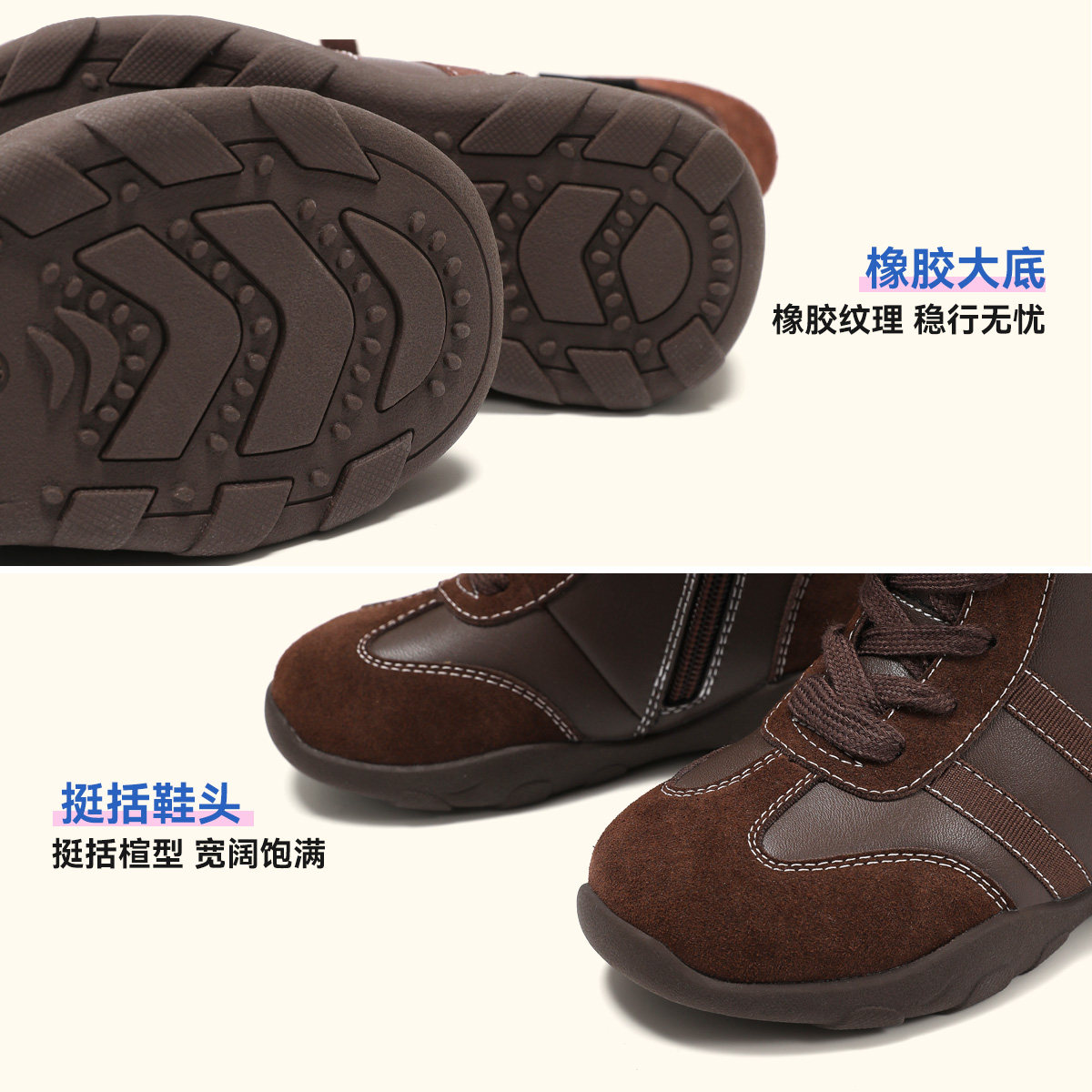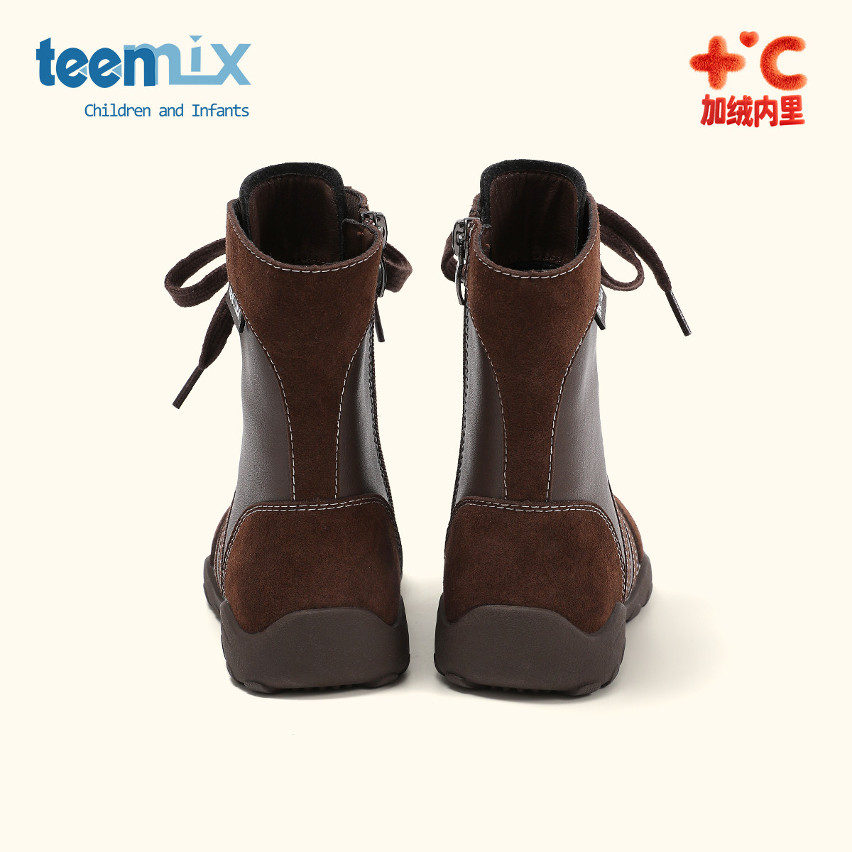 天美意童鞋2025冬季新款女孩系带马丁靴棕色短靴女童加绒保暖棉靴