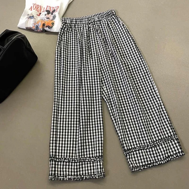 阔腿格子木耳花边直筒裤女夏季小个子七分裤子百搭棉麻休闲裤xxs8