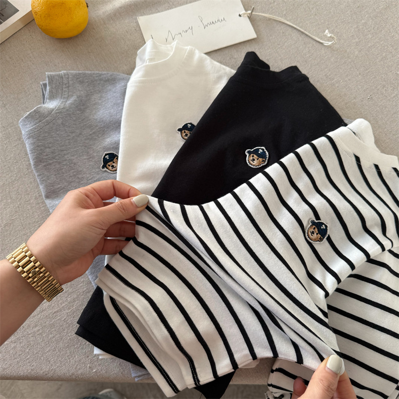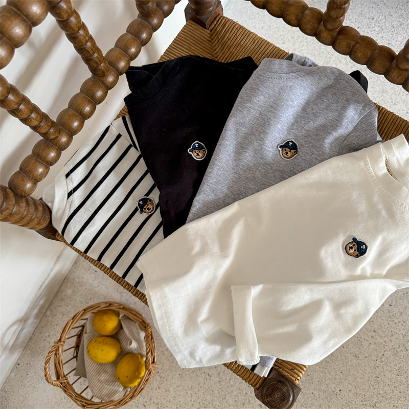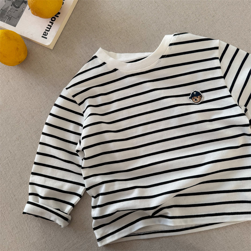 男童长袖打底衫条纹小熊刺绣宝宝纯棉T恤薄款25春儿童圆领T恤弹力