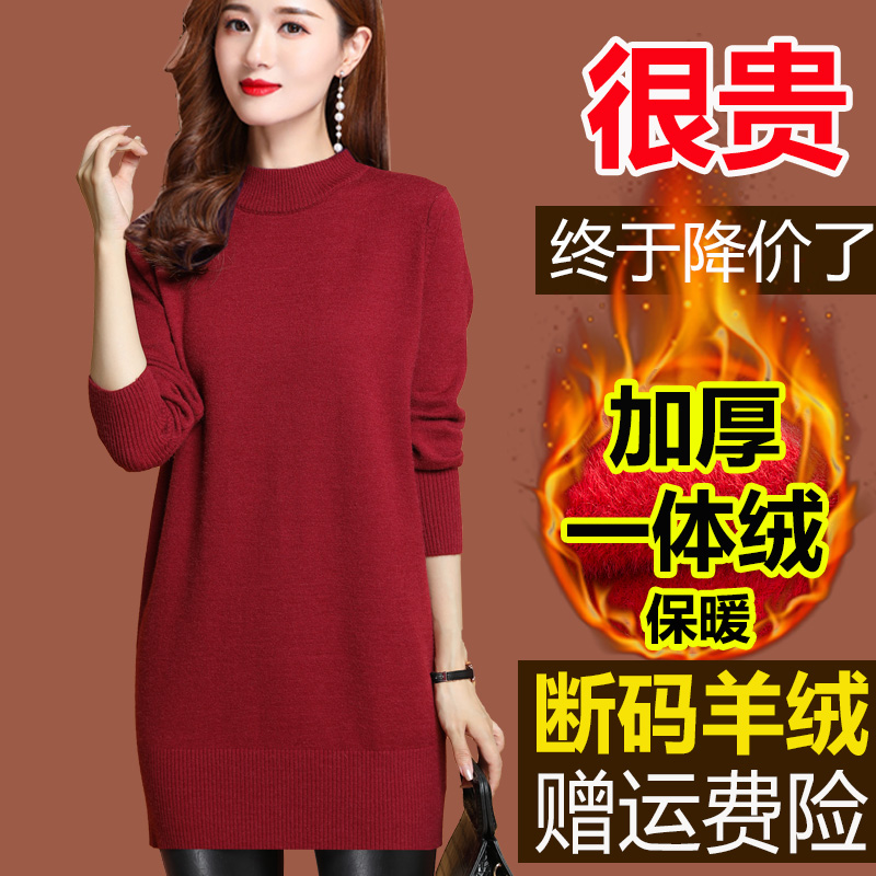 鄂尔多斯市羊绒衫宽松打底内搭秋冬季中长款加绒毛衣女一体绒加厚