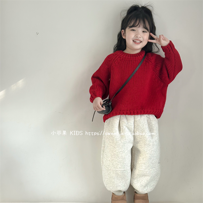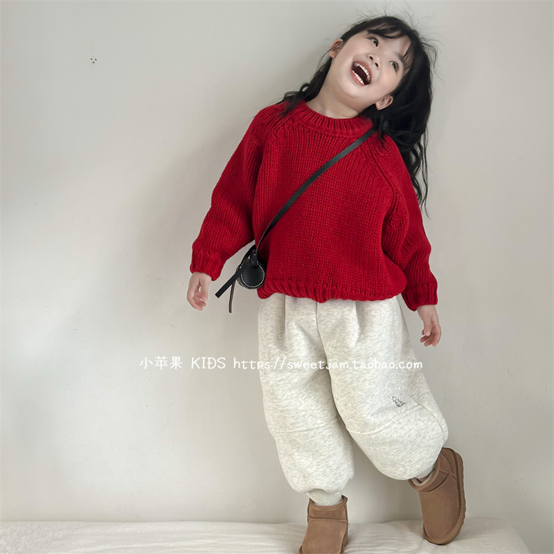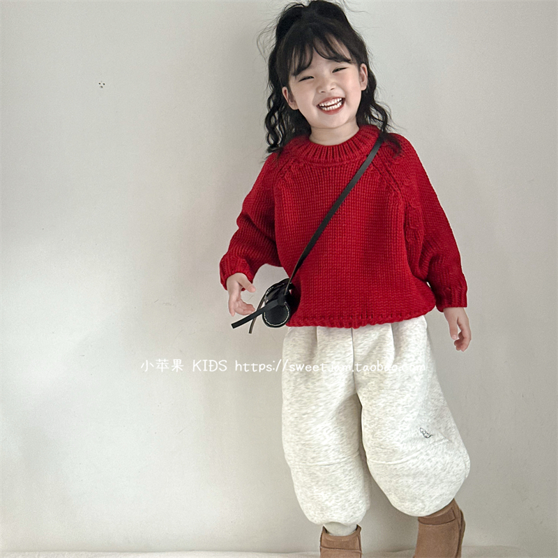 洋气新年款~秋冬韩版儿童毛衣男女潮宝宝复古红色套头插肩针织衫