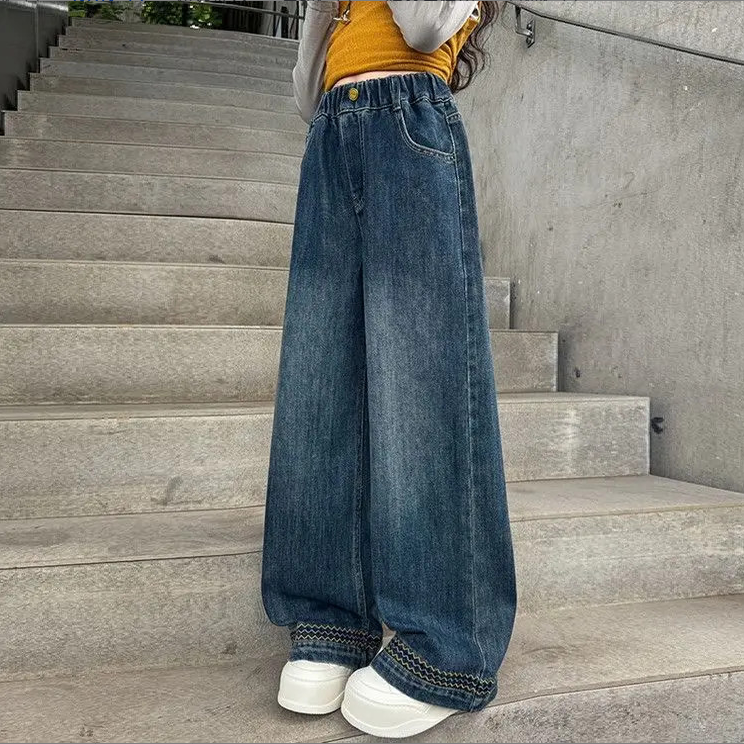 女童牛仔裤春秋中大童宽松阔腿裤女孩休闲洋气高腰中大童牛仔长裤