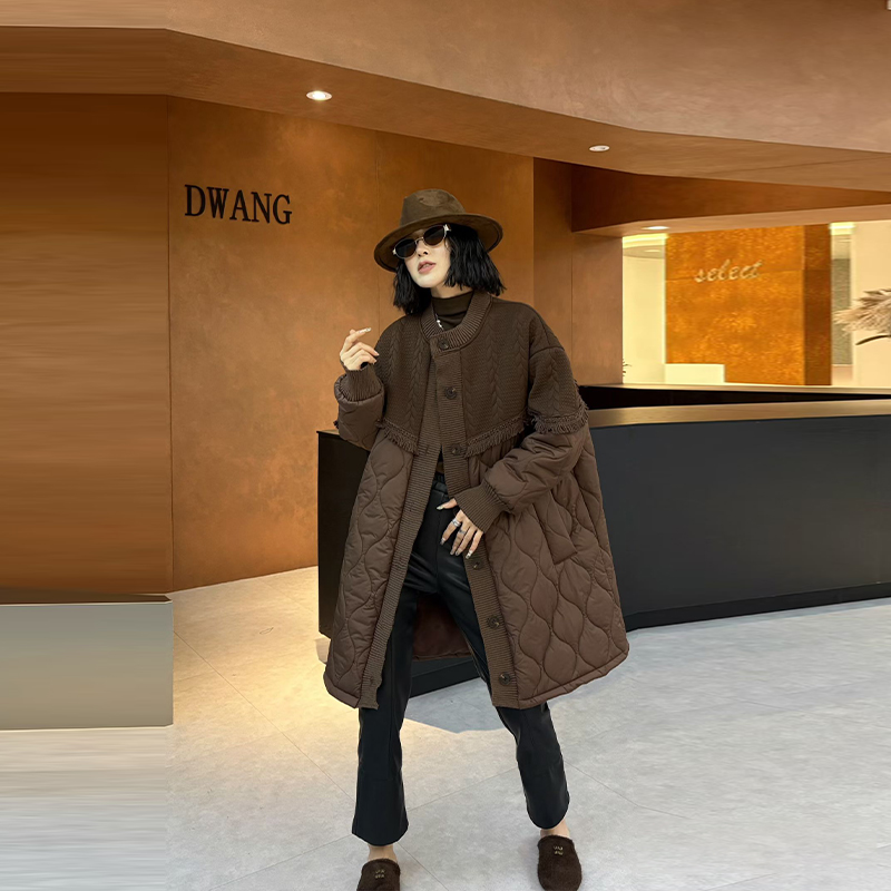 加肥拼接菱形格加棉底摆长袖外套大码女装2025秋冬款简约轻薄棉服