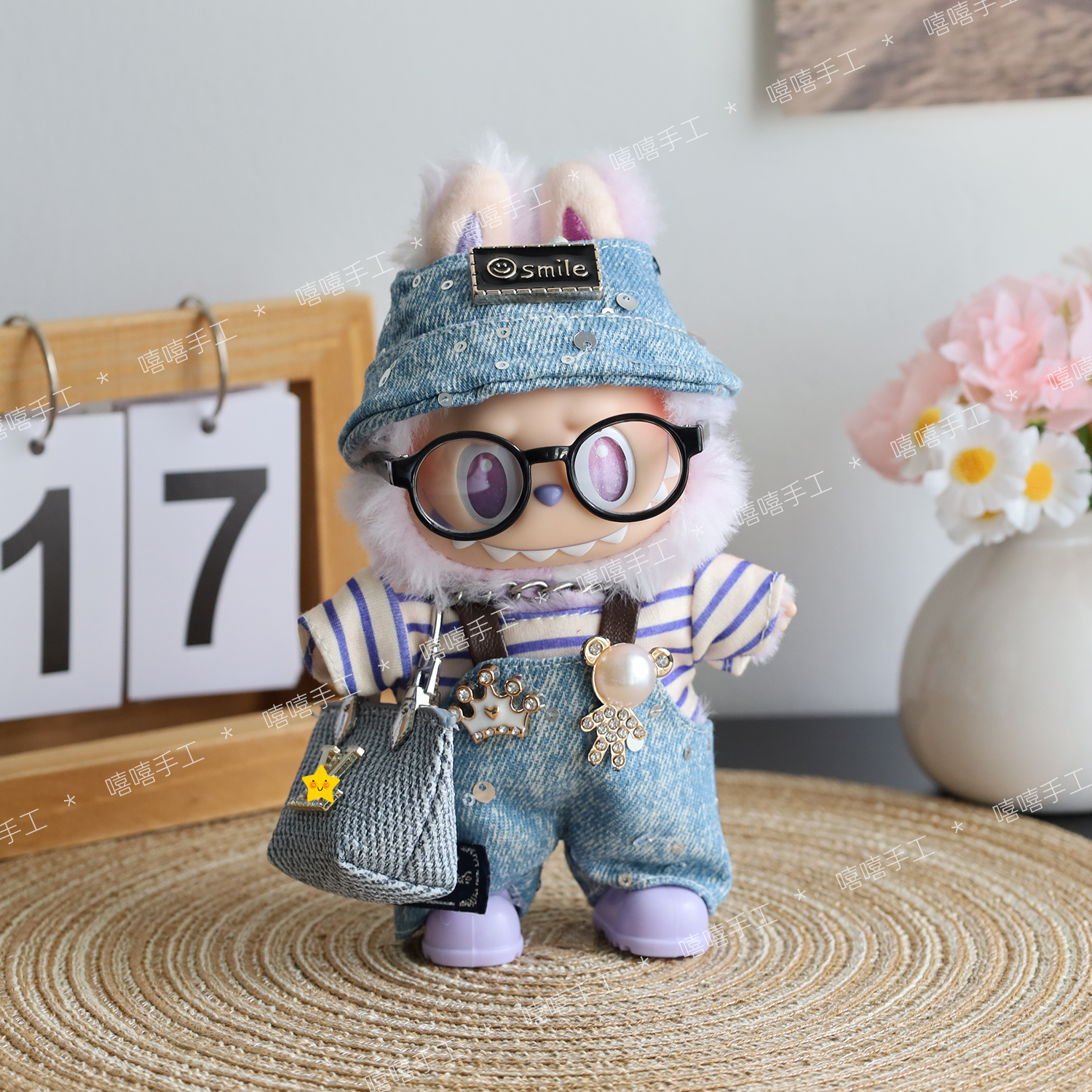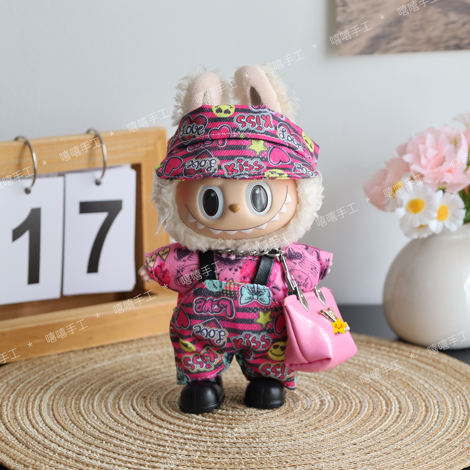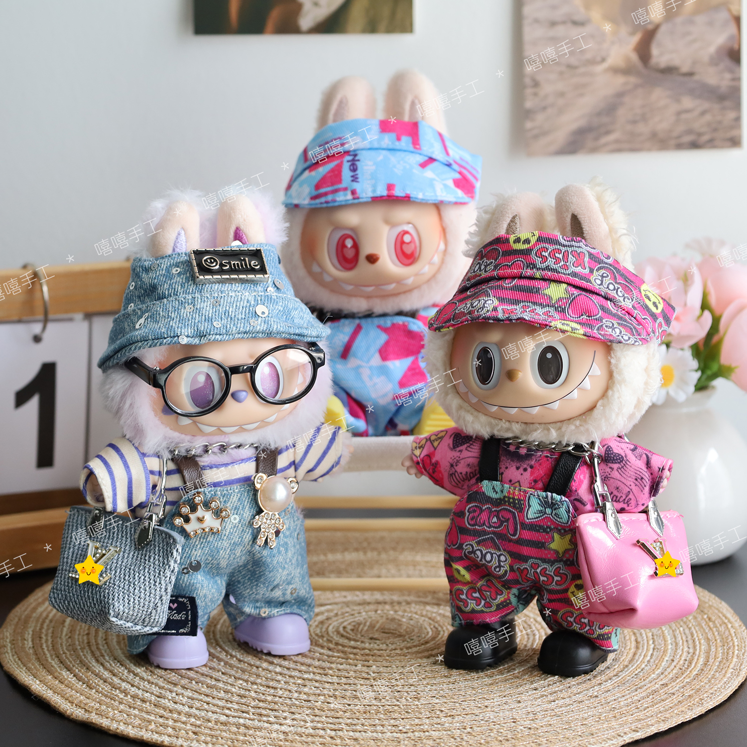 labubu娃衣一代二代三代拉布布街头风帽子涂鸦时尚牛仔背带裤套装