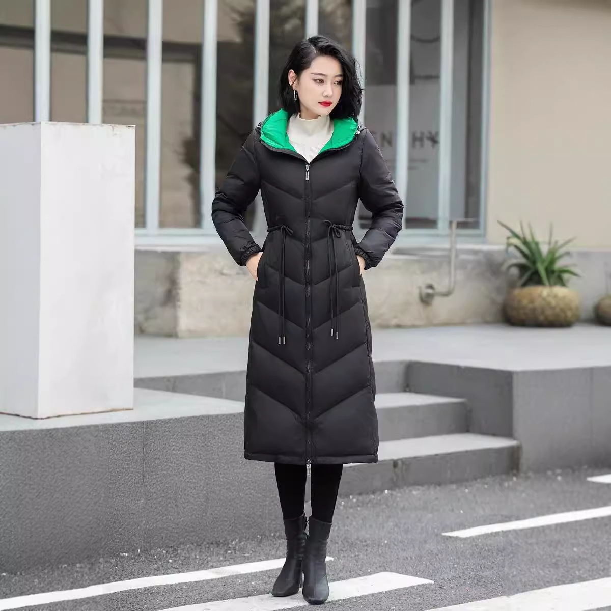 2024年秋冬新款轻薄款羽绒服女长款连帽过膝收腰抽绳撞色压胶外套