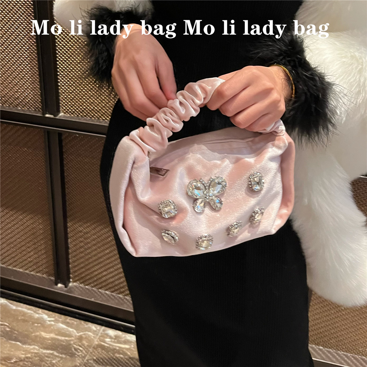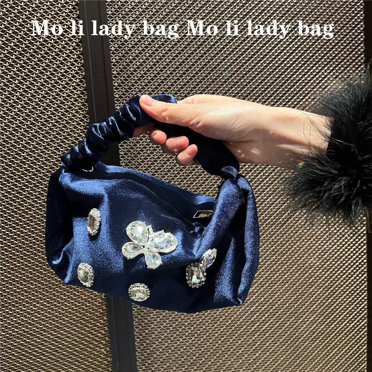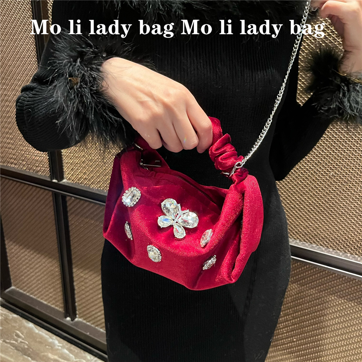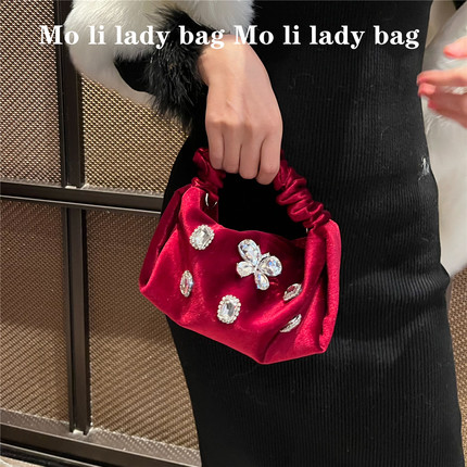 法式小众丝绒镶钻饭盒包甜美皱褶手提包晚宴包水钻高级感斜跨包女