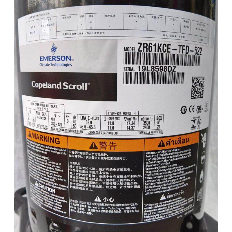 谷轮压缩机ZR61KCE-TFD-522空调空气能热泵冷藏冷冻冷库涡旋式