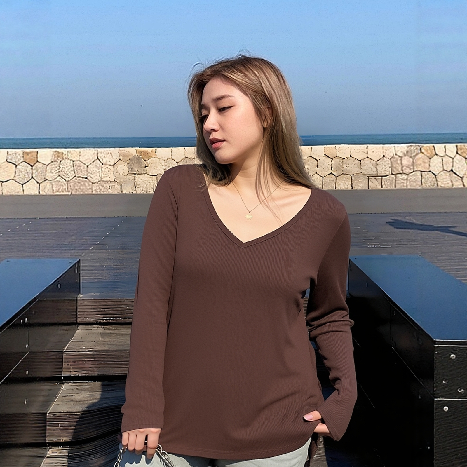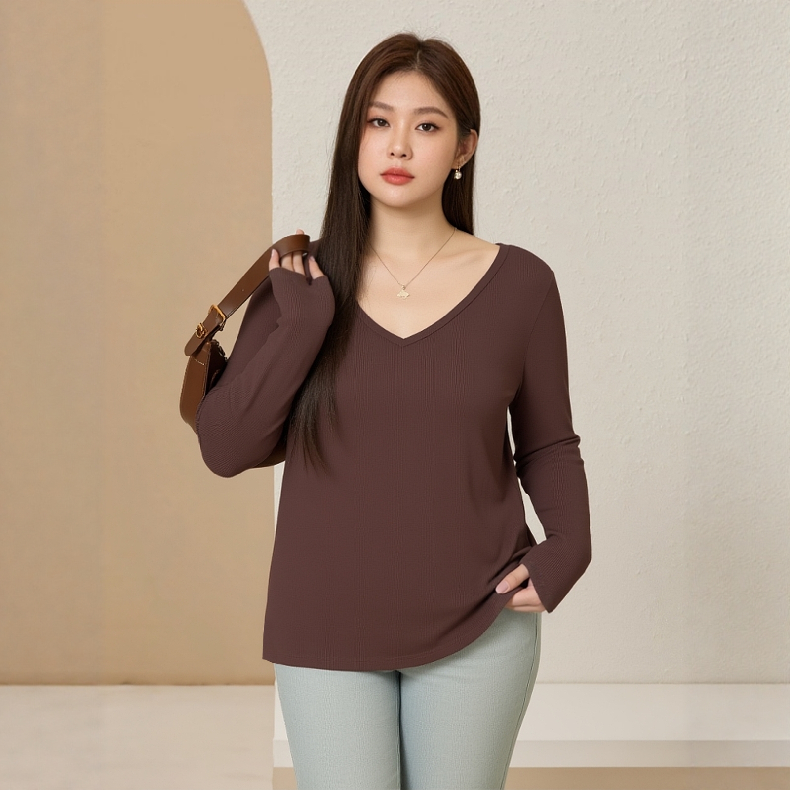 大码v领上衣美拉德咖啡色打底衫宽松女装遮肚子针织衫胖mm秋装T恤