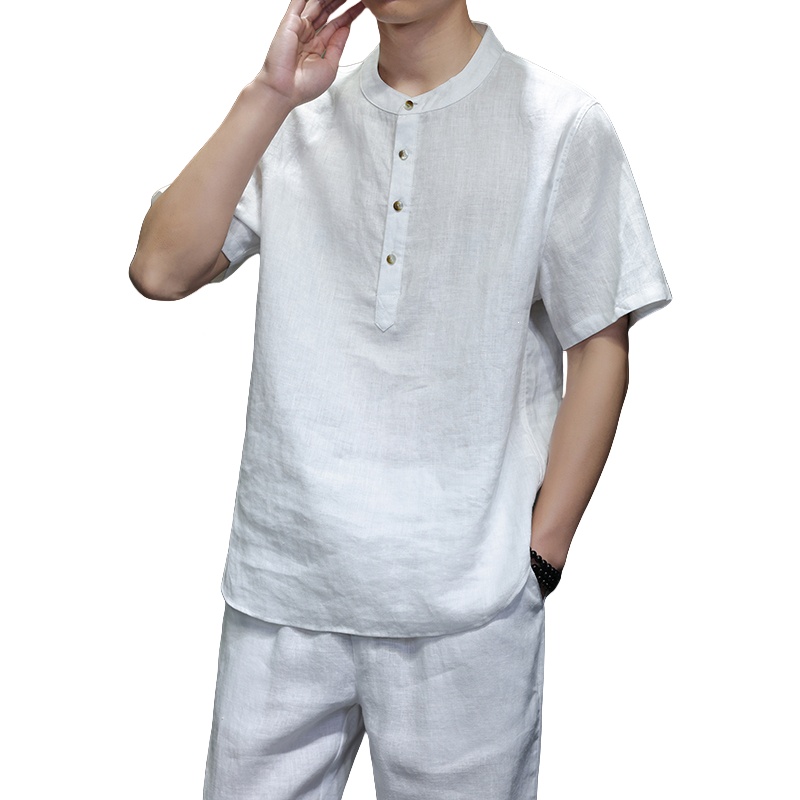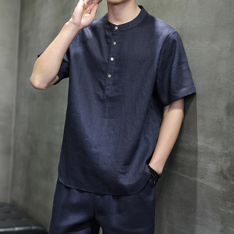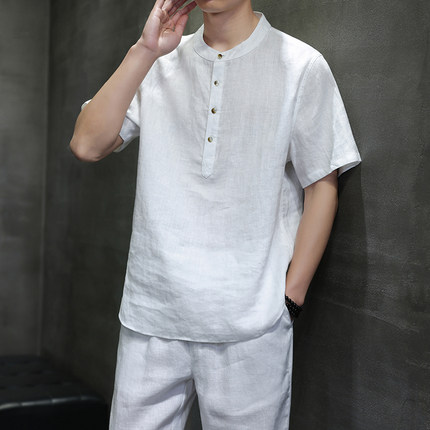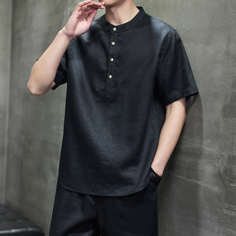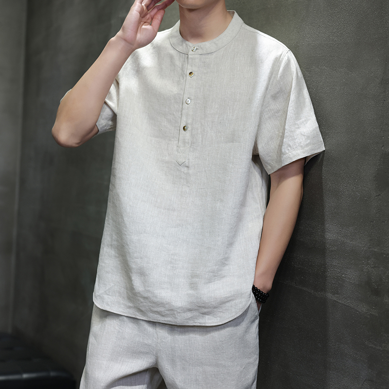 夏季男士短袖t恤莱赛尔亚麻五分袖中袖体恤衫大码中国风男装唐装