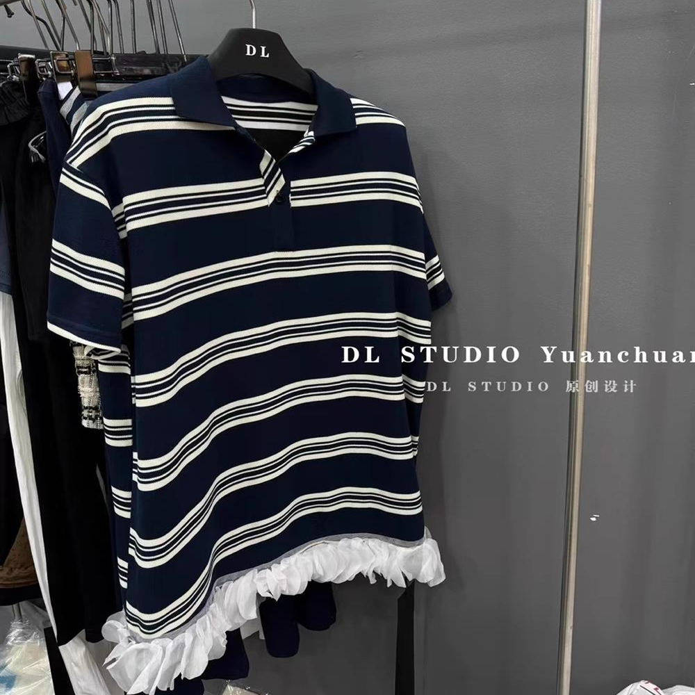 2025夏季新款宽松休闲条纹Polo领短袖T恤裙女下摆蕾丝花边连衣裙