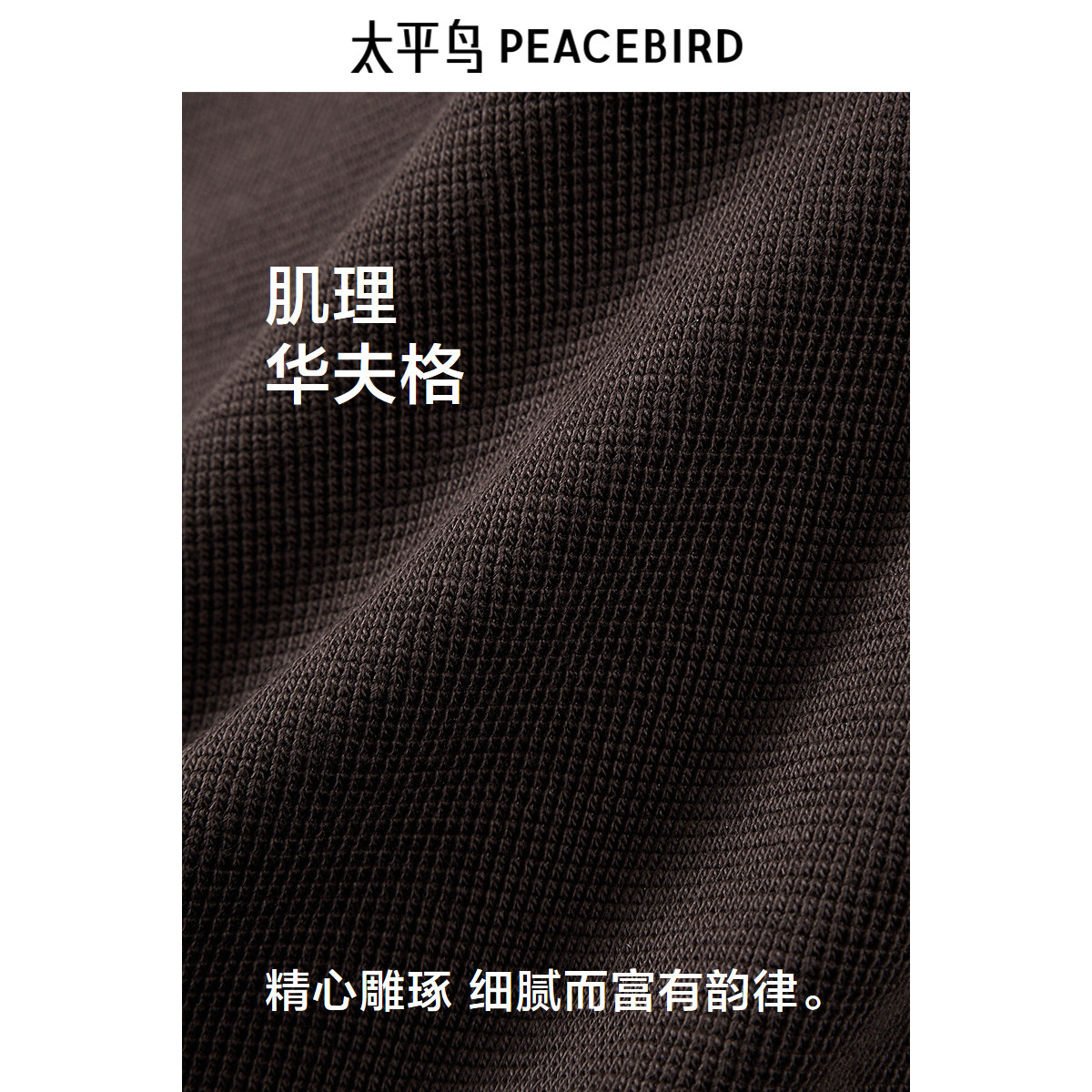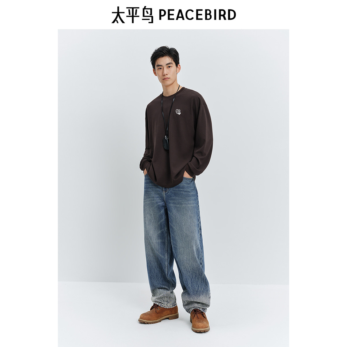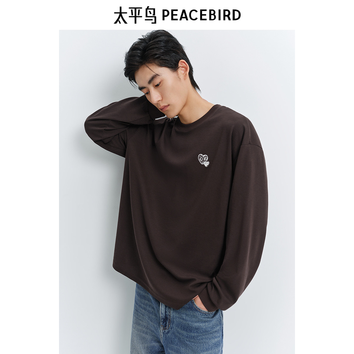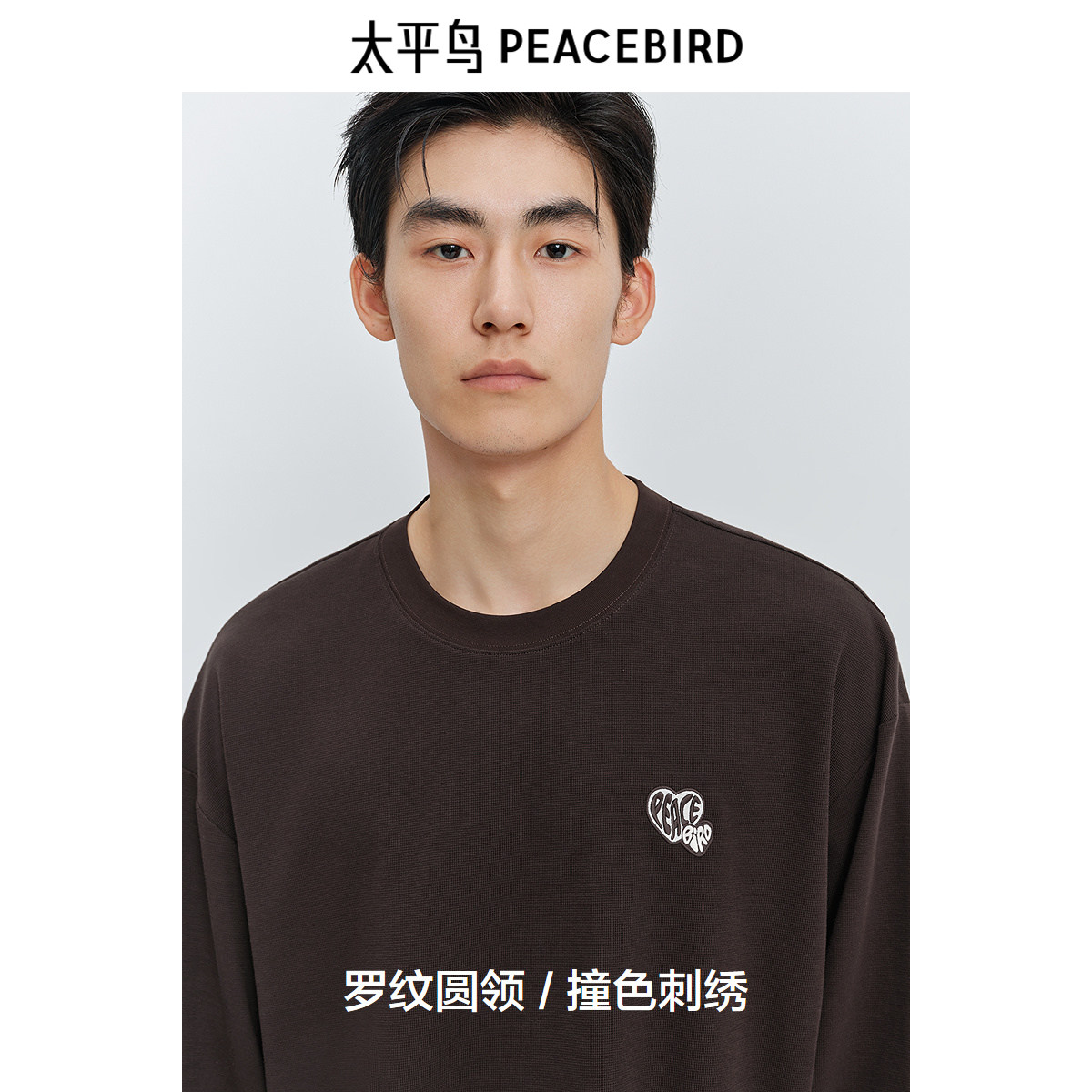 太平鸟男装华夫格长袖T恤2025春圆领刺绣打底衫时尚宽松体恤