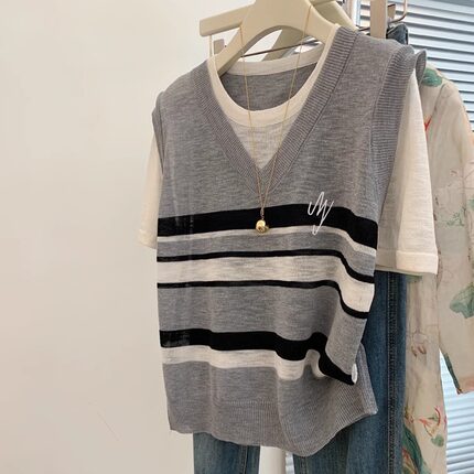 【80-200斤】假两件撞色正肩短袖T恤女夏季宽松显瘦冰丝针织上衣