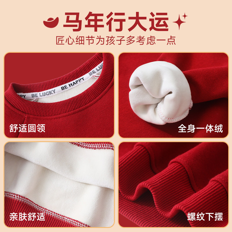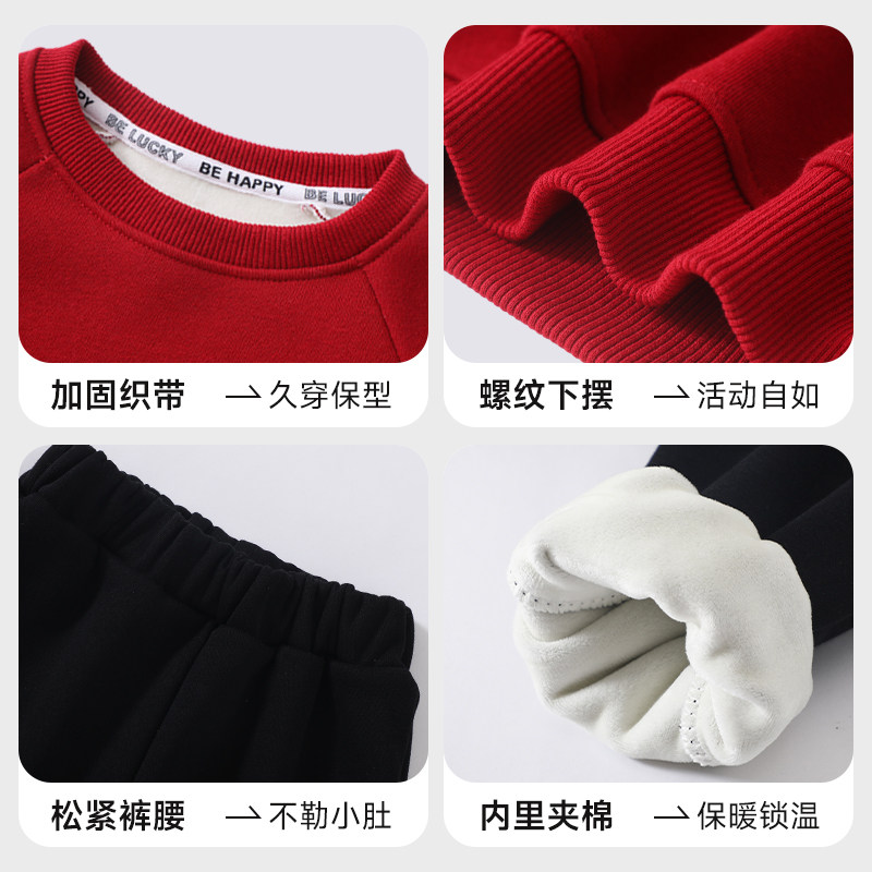 儿童红色卫衣套装新年秋冬季女宝宝裤子加厚冬装男童拜年过年衣服