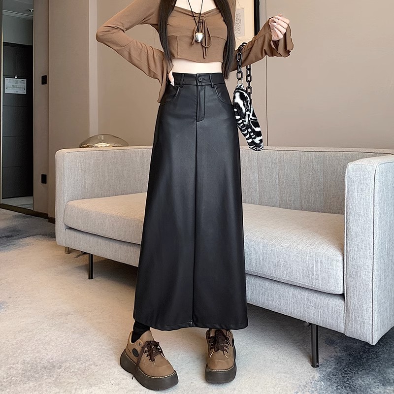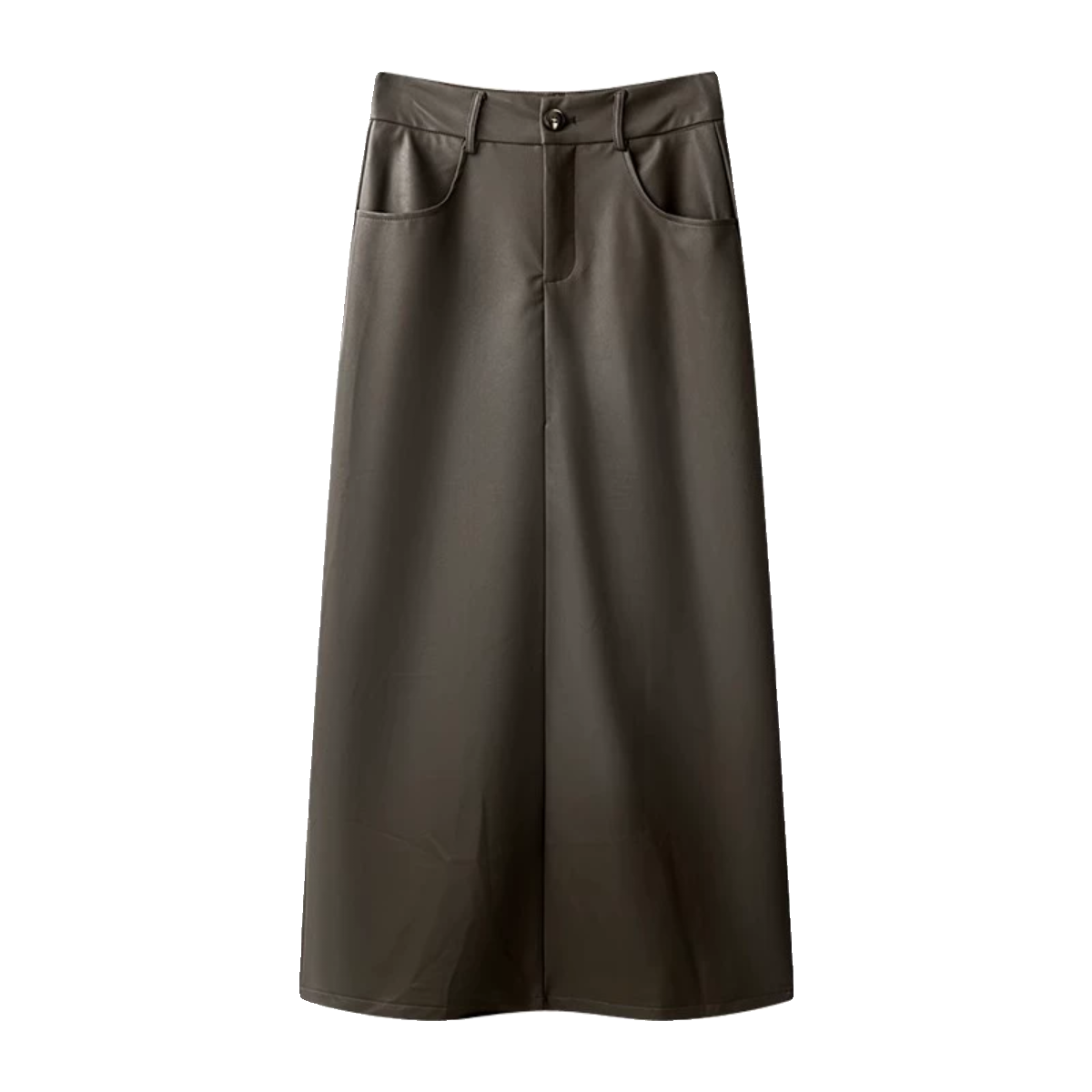 美式复古咖色pu皮裙半身裙女秋季中长款高腰后开叉a字包臀长裙子