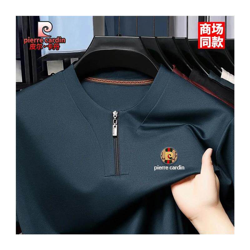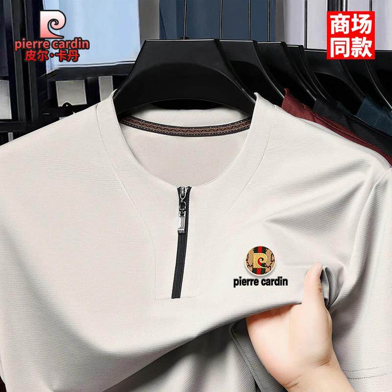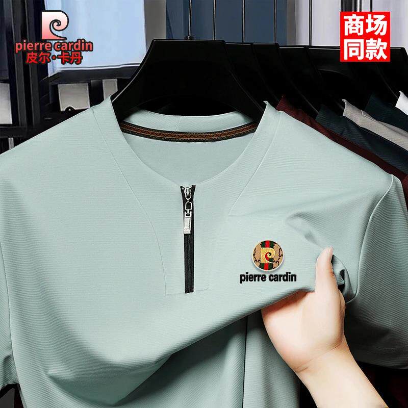 皮尔卡丹短袖t恤男士夏季薄款高档桑蚕丝V领半拉链休闲时尚半袖衫