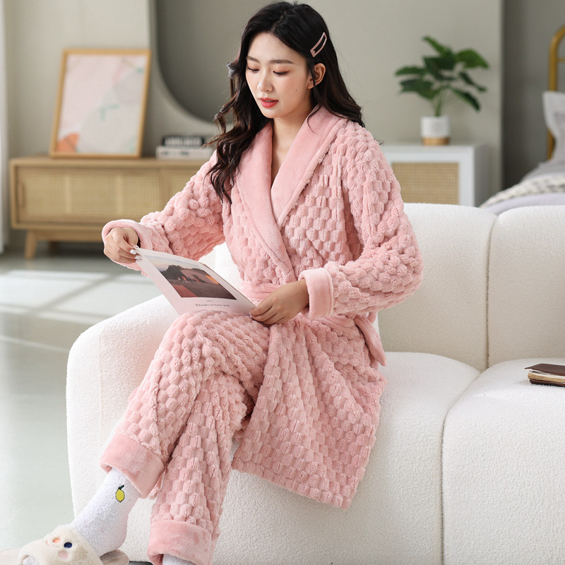 睡衣女秋冬可外穿两件套加裤子珊瑚绒睡袍加厚浴衣法兰绒吸水浴袍