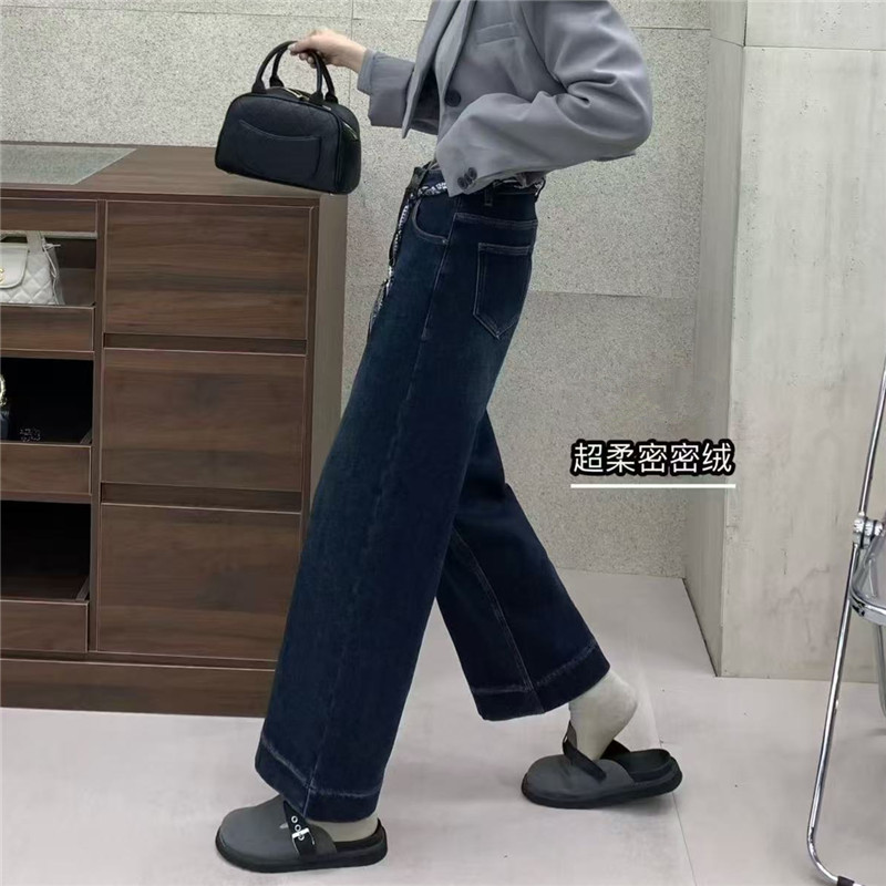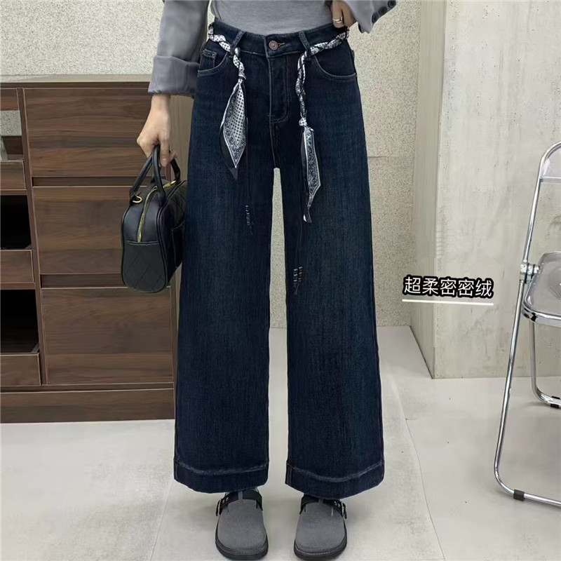 腰带装饰牛仔阔腿裤女2025冬加厚复合绒高腰宽松显瘦九分直筒裤