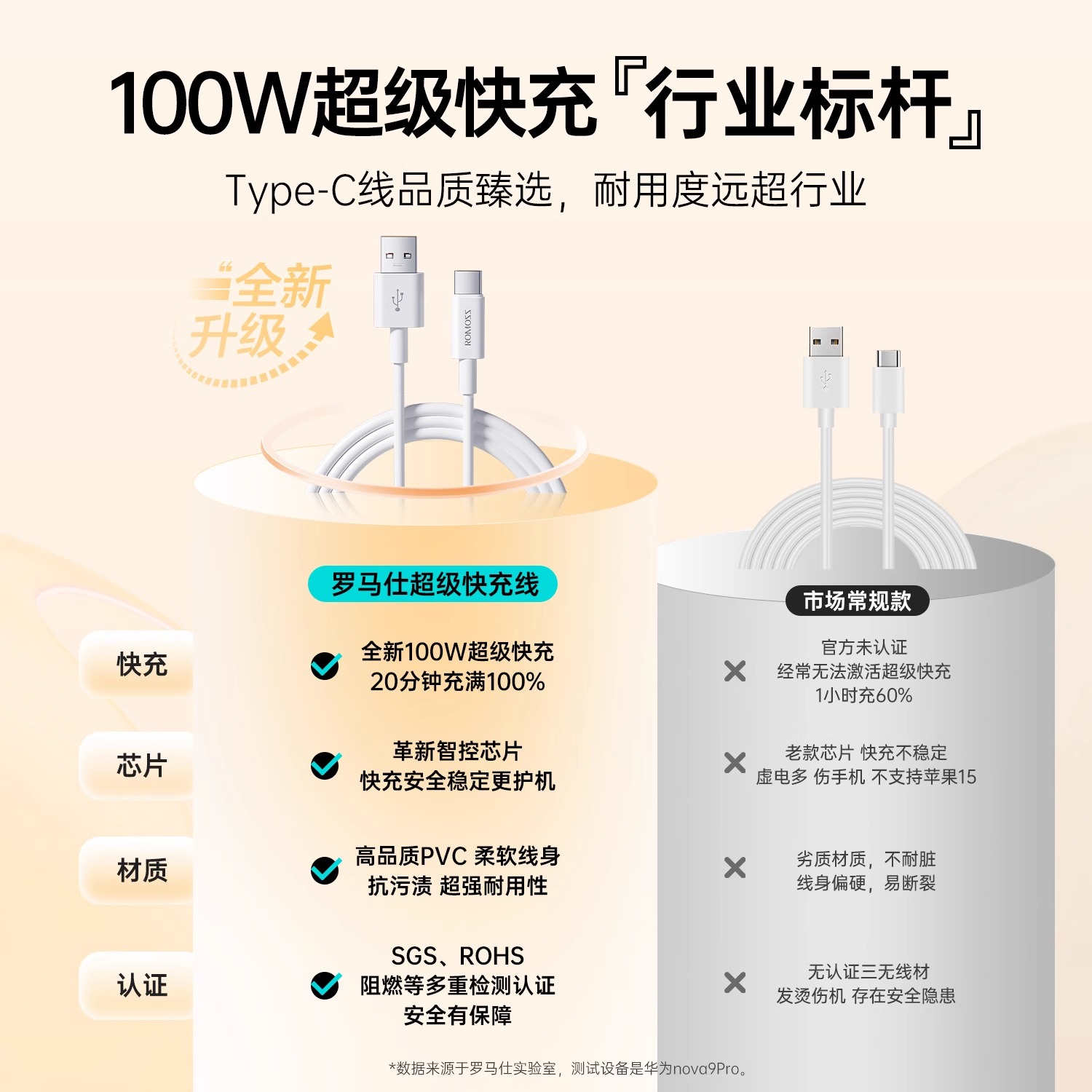 罗马仕Type-C数据线适用于华为荣耀充电100W66W40W超级快充闪充适用于iPhone 15/16/17加长车载usb转tpc
