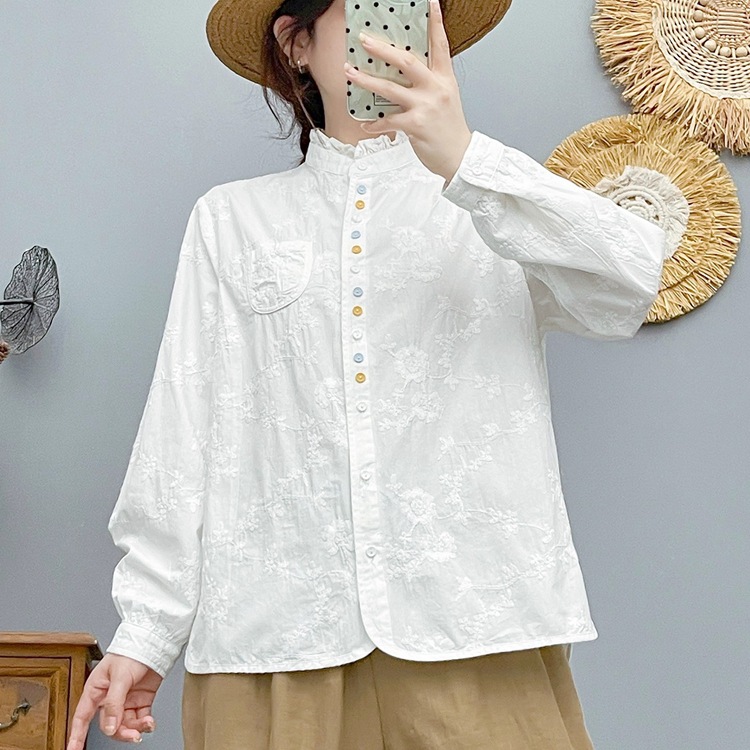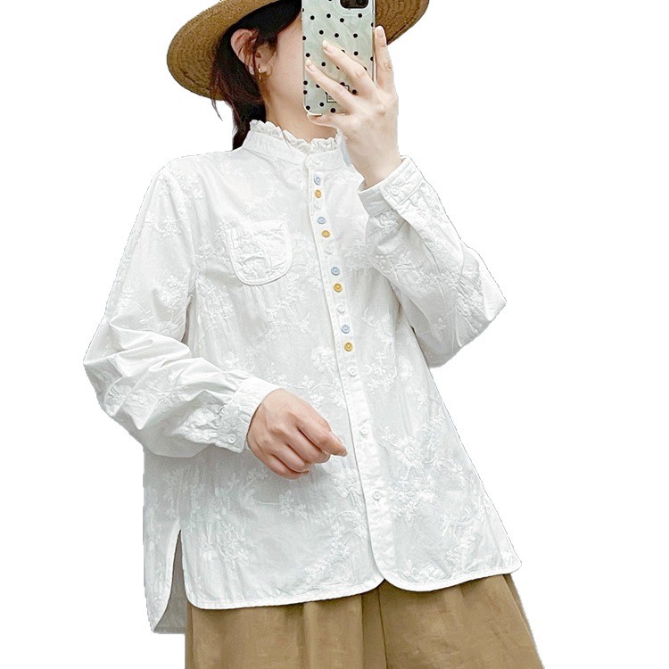 温柔小个子蕾丝浮雕梅花刺绣彩扣纯棉正肩白衬衫女长袖打底衫通勤