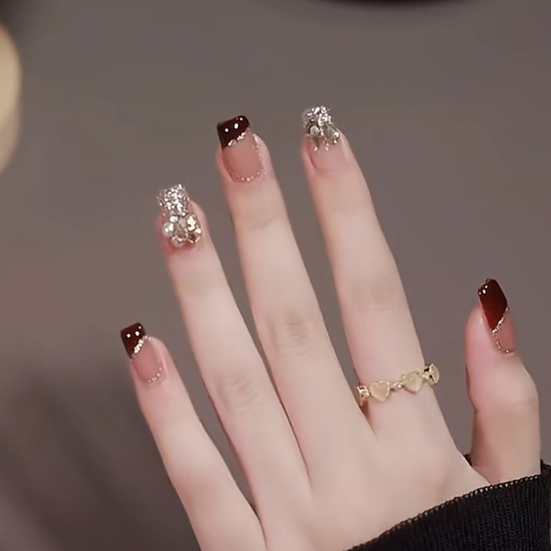 手工定制成品美甲贴片 中款酒红色法式镶钻指甲贴片 显白穿戴甲贴