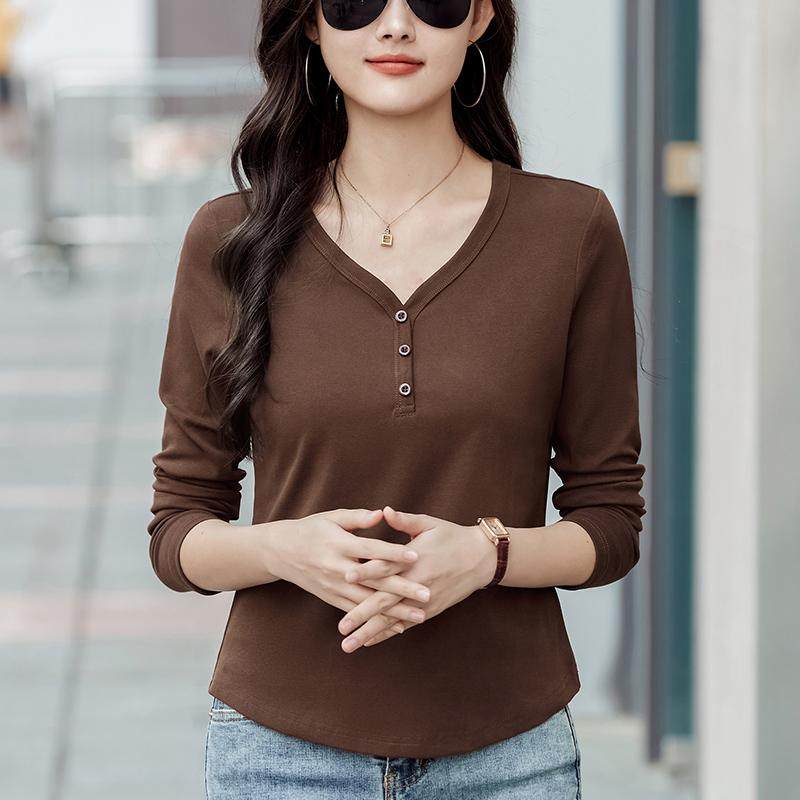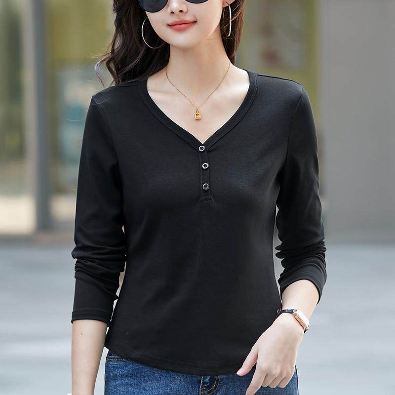 纯棉白色打底衫女长袖V领春装新款薄款鸡心领宽松黑色上衣秋衣潮