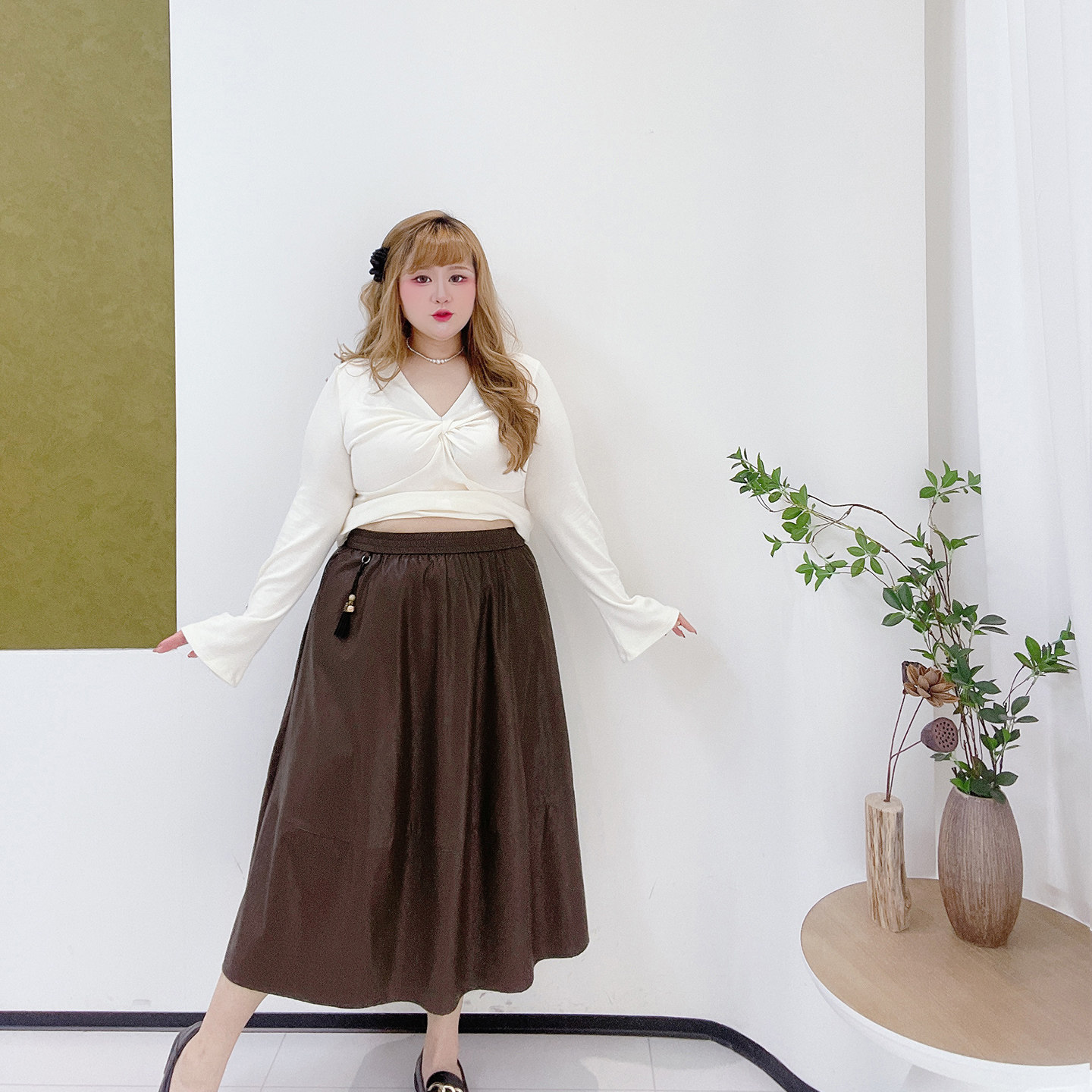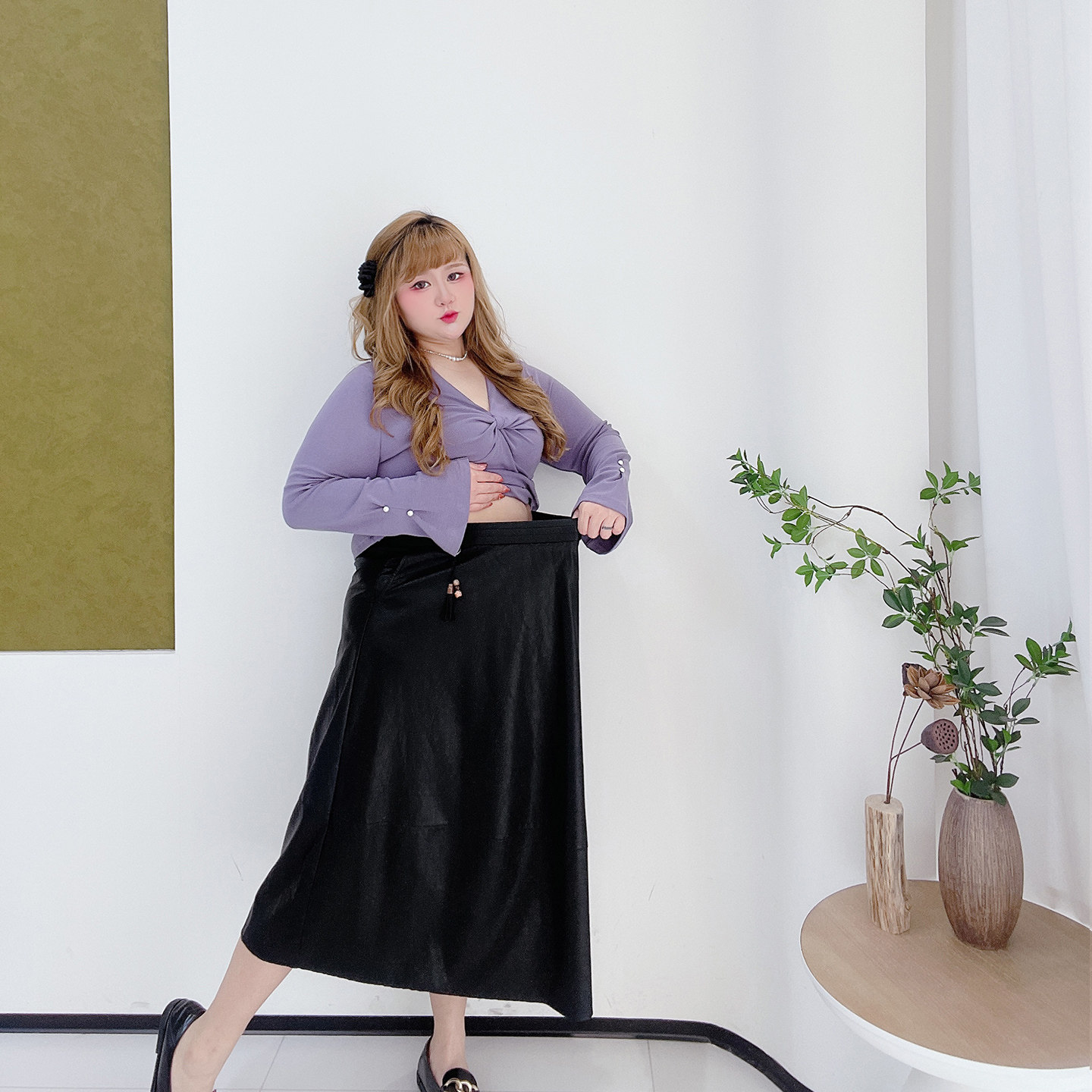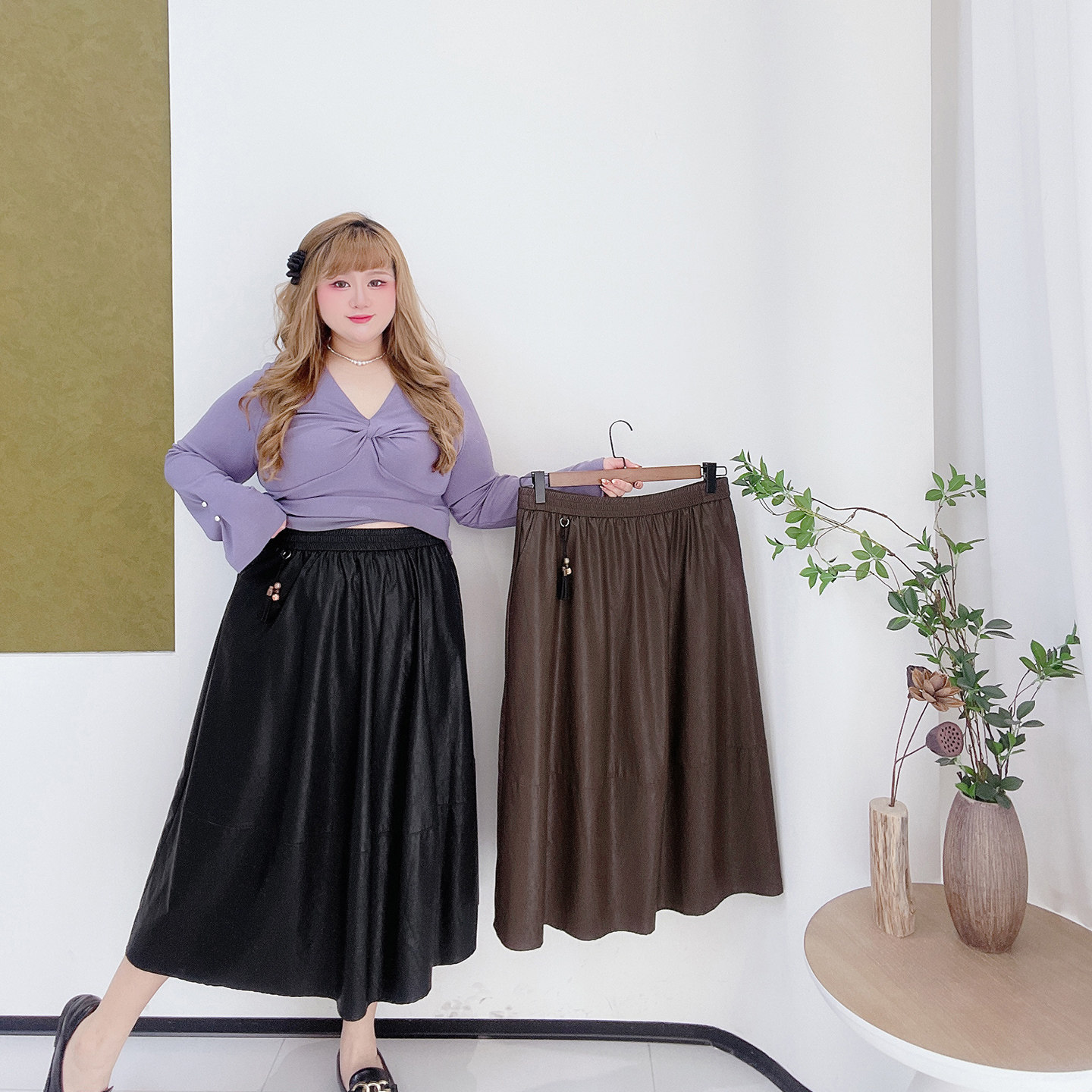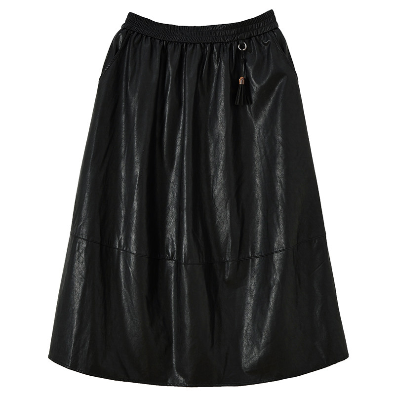 大码法式设计感松紧腰pu半身裙