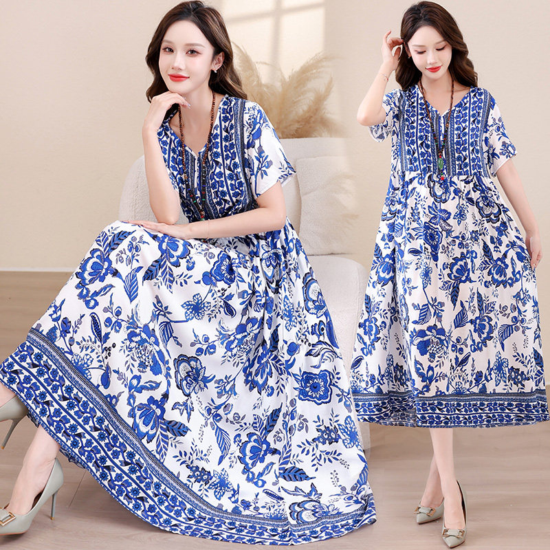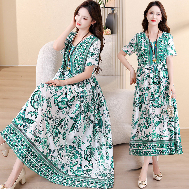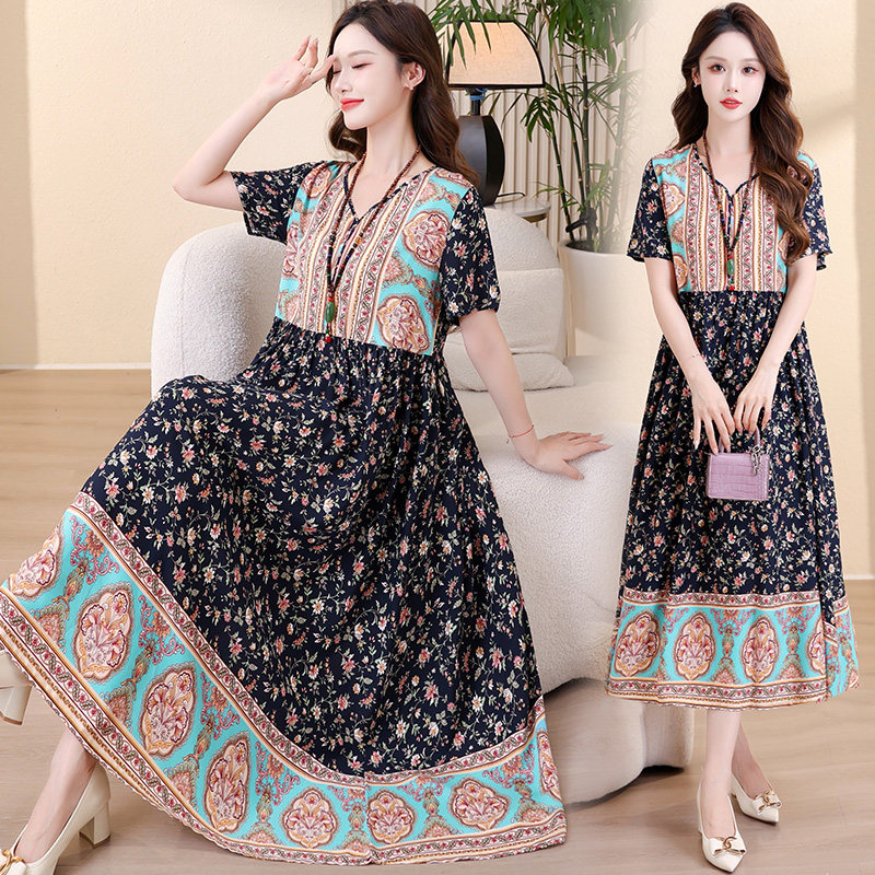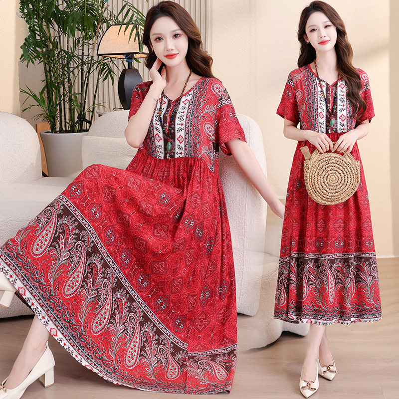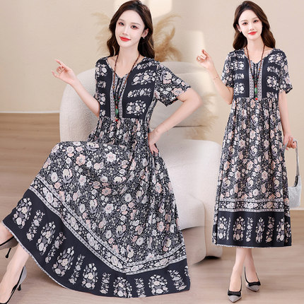 新款棉绸连衣裙女夏季民族风气质甜美高端年轻妈妈度假风沙滩裙子