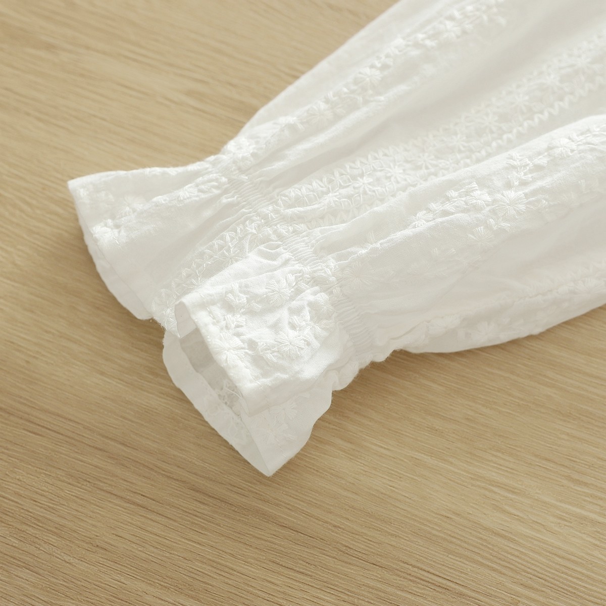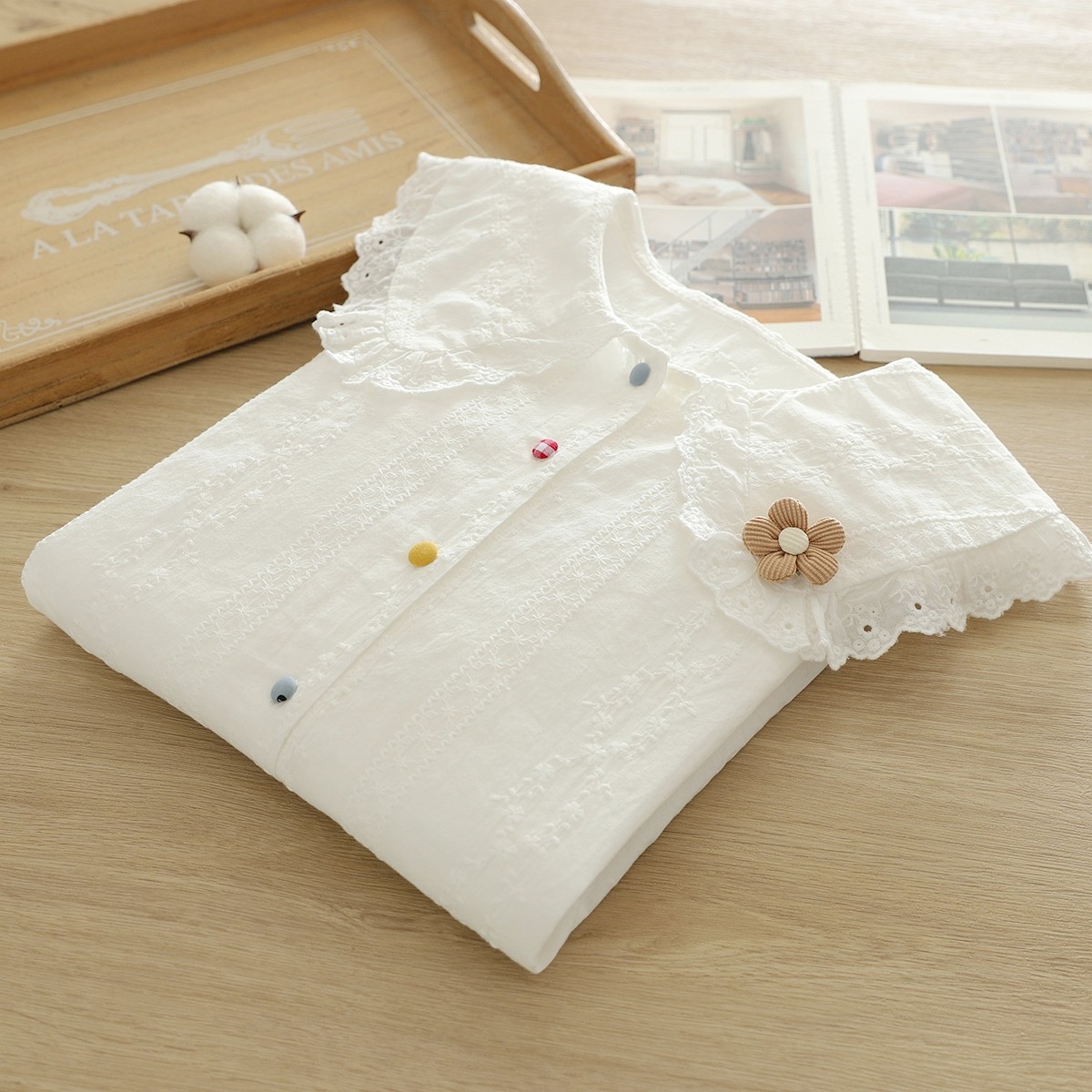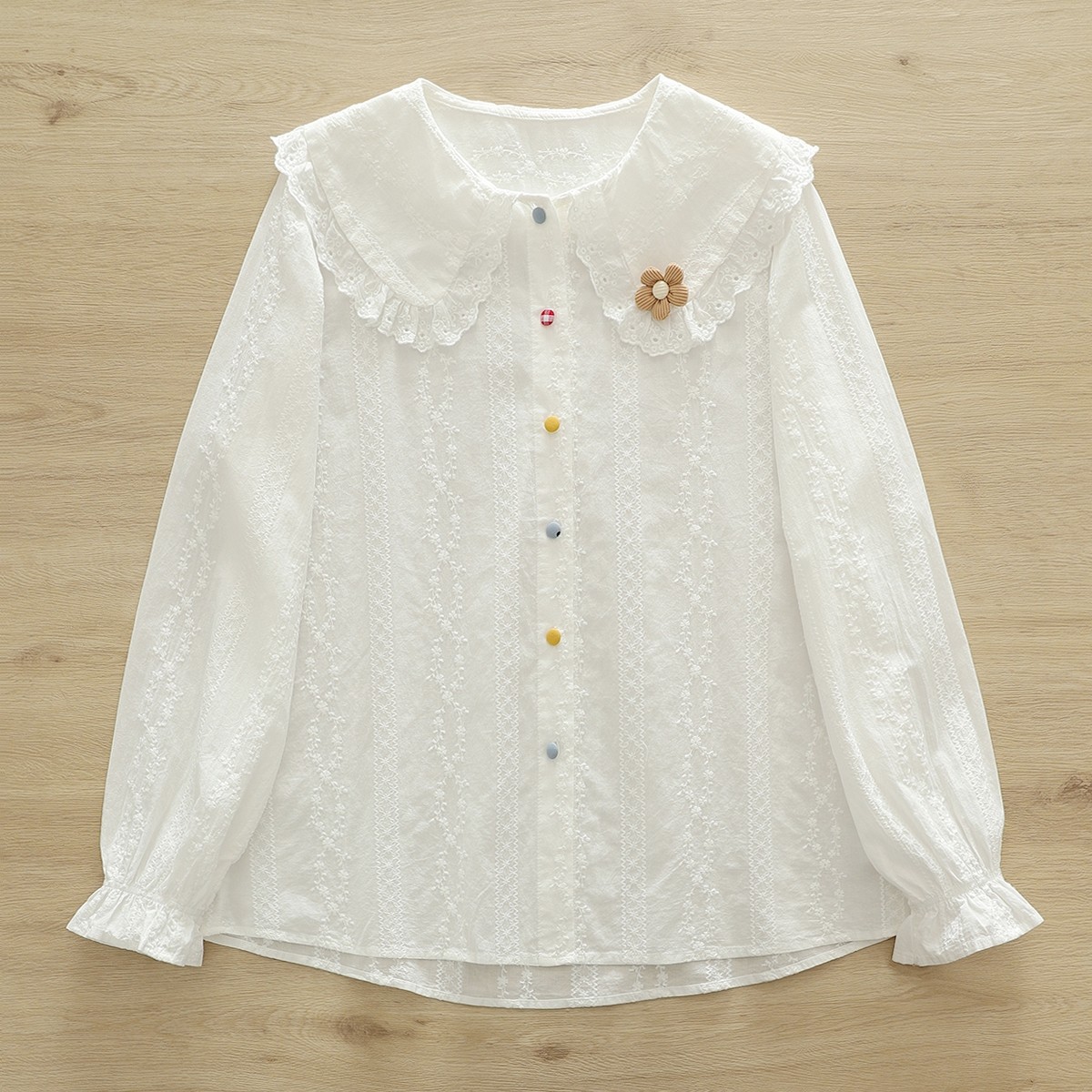 文艺小清新甜美蕾丝刺绣娃娃领立体花朵彩扣纯棉正肩白衬衫女长袖