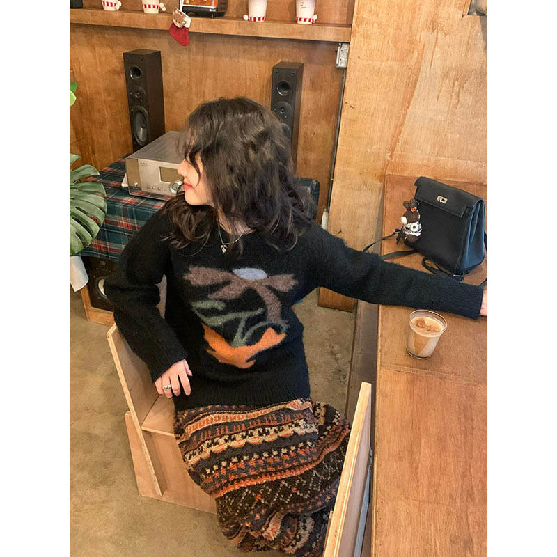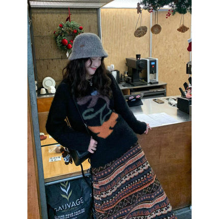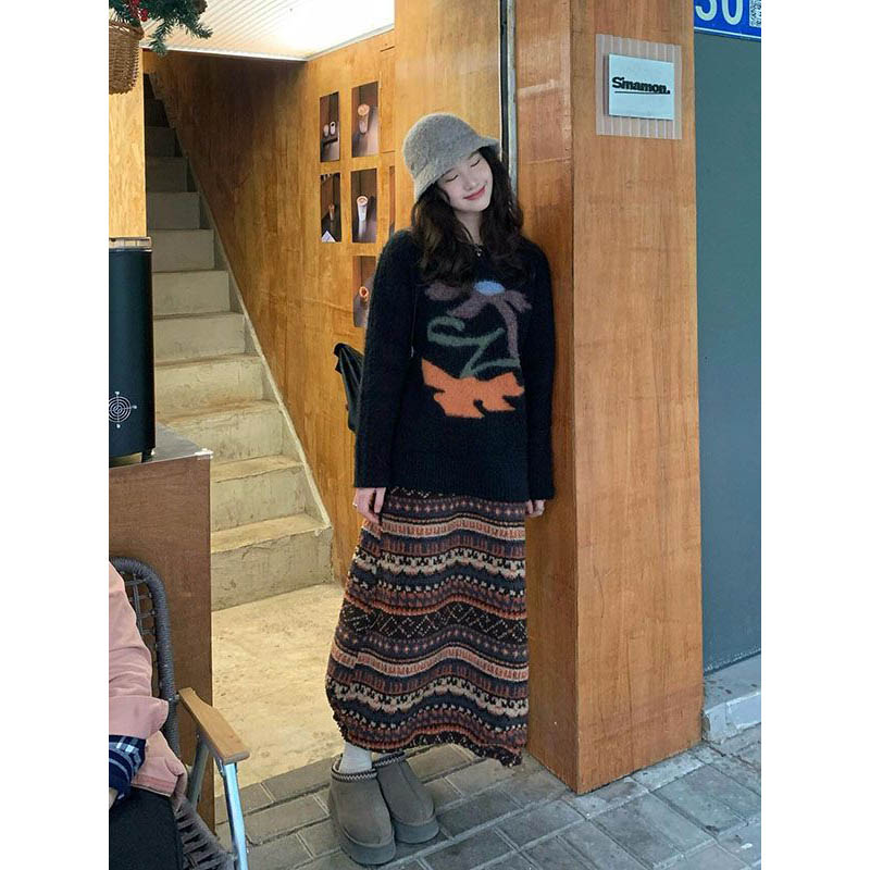 套装/单件女春季新款韩版复古风黑色提花圆领毛衣+费尔岛半身长裙