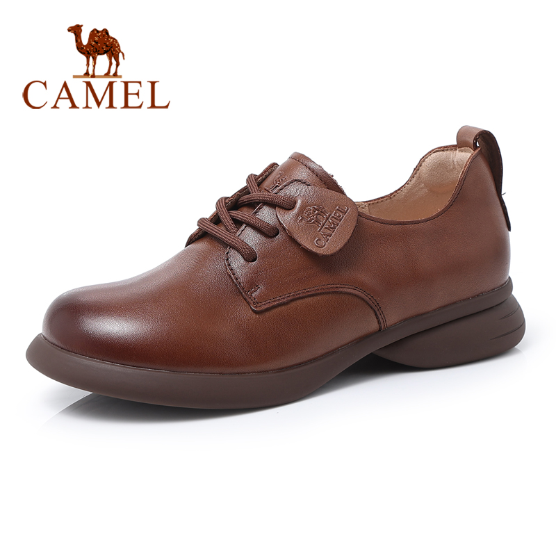 骆驼女鞋2025秋季新款复古真皮休闲鞋女单鞋厚底乐福鞋系带小皮鞋