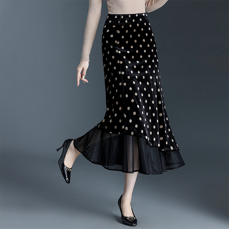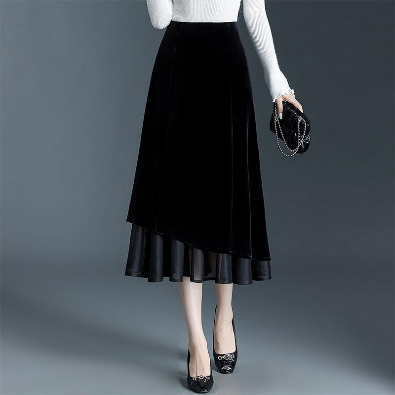 金丝绒网纱拼接鱼尾裙半身裙女秋冬2025高腰包臀显瘦中长款丝绒裙