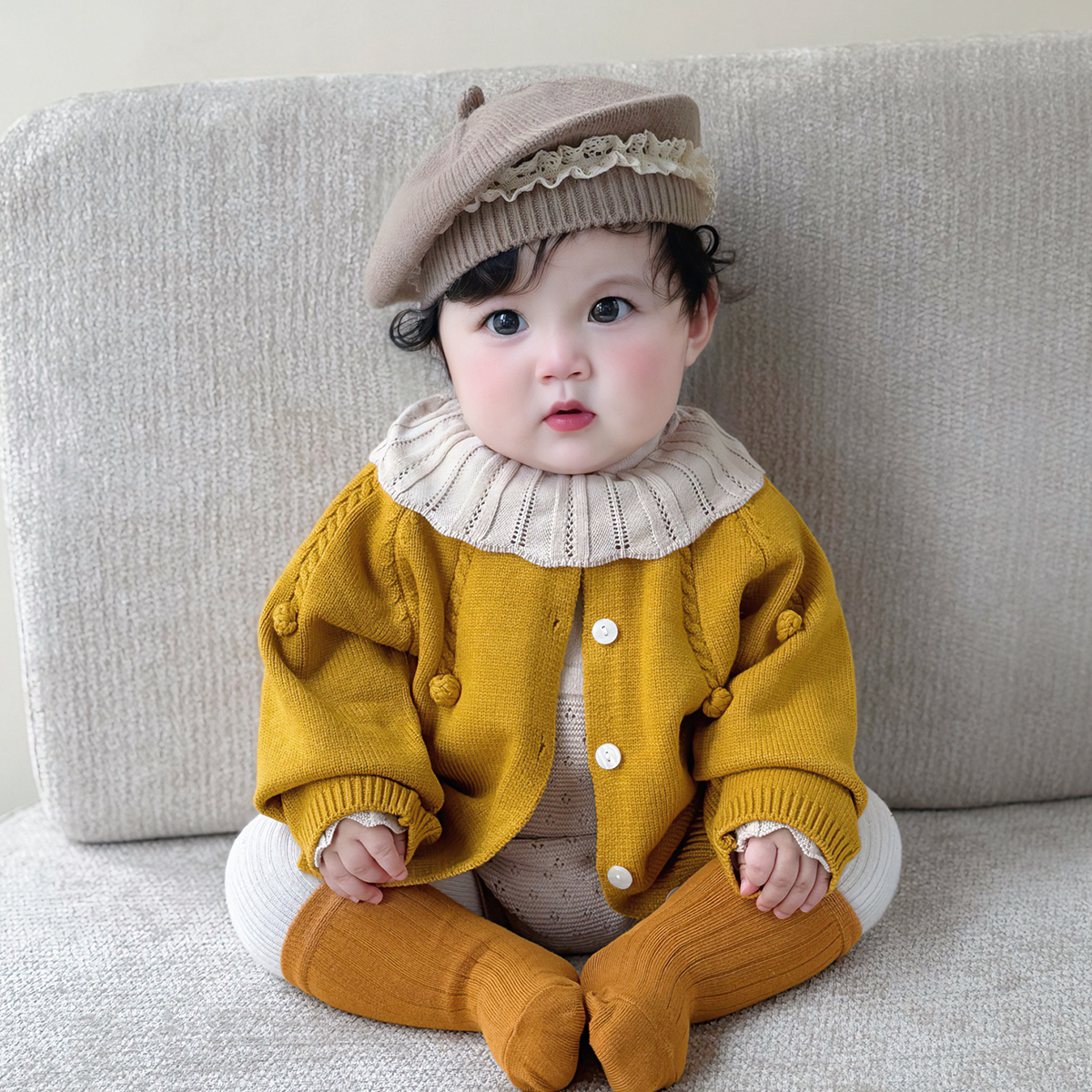 拉果拉韩版女宝宝秋装芥黄色毛衣开衫棉质针织衫翻领爬服洋气套装