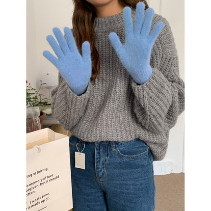 芝士商店~韩系蓝色五指兔毛手套女冬季毛绒针织保暖骑行分指手套