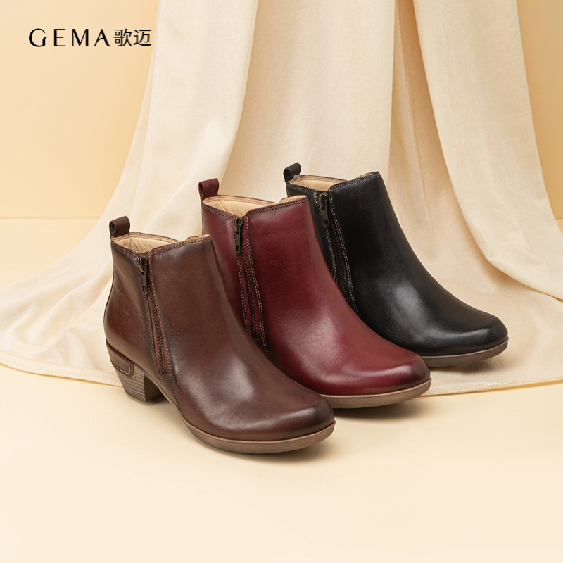 冬季女靴中跟短靴女手工真皮头层牛皮棕色软底复古皮鞋歌迈女鞋