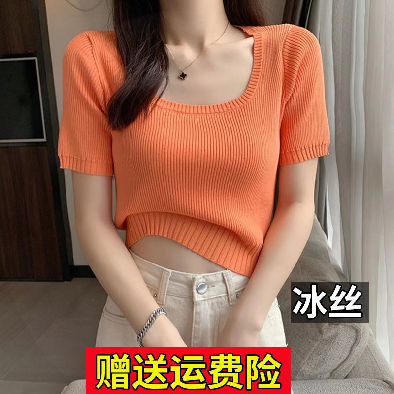 大码冰丝针织短袖t恤女白色方领