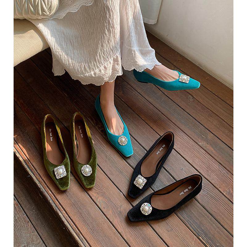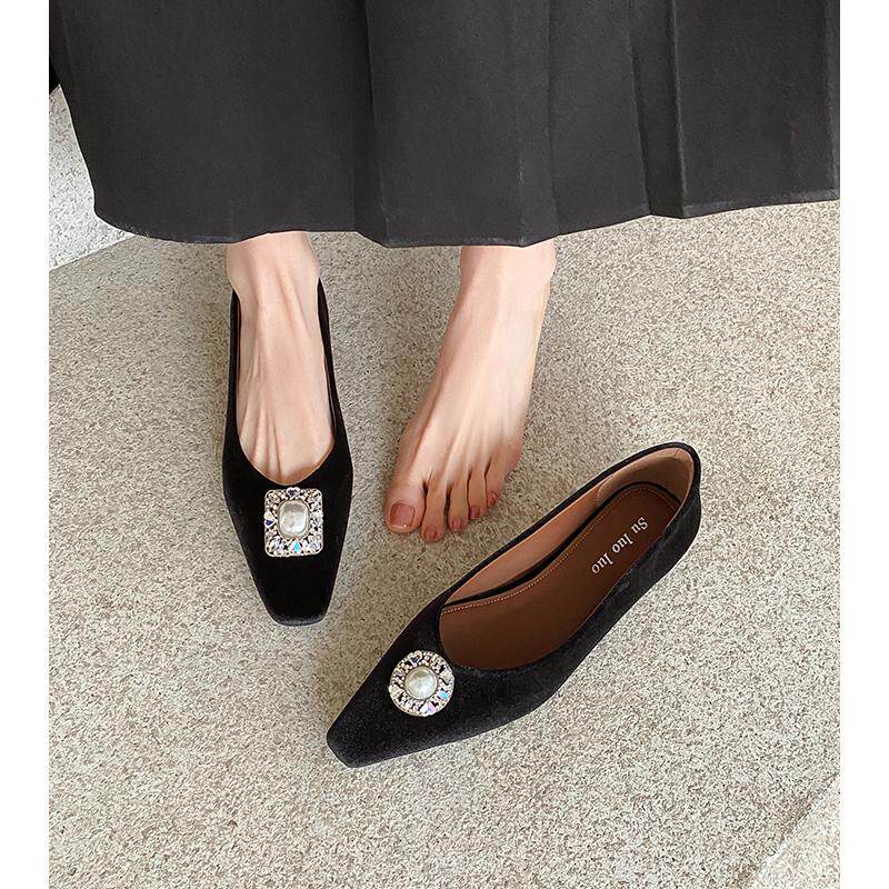 Kmeizu高级丝绒~3cm内增高水钻单鞋女春小方头新中式国风平底瓢鞋