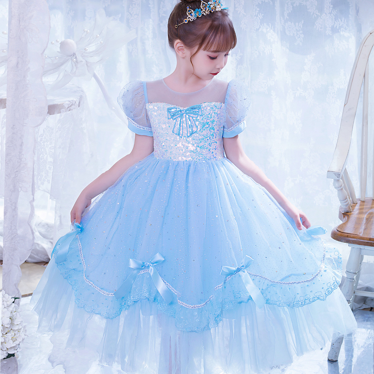 冰雪奇缘爱莎公主裙女童夏装短袖新款灰姑娘儿童正版生日连衣裙子