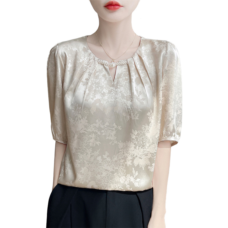 2025夏季新款女装新中式国风桑蚕丝真丝缎面T恤薄款短袖盘扣上衣