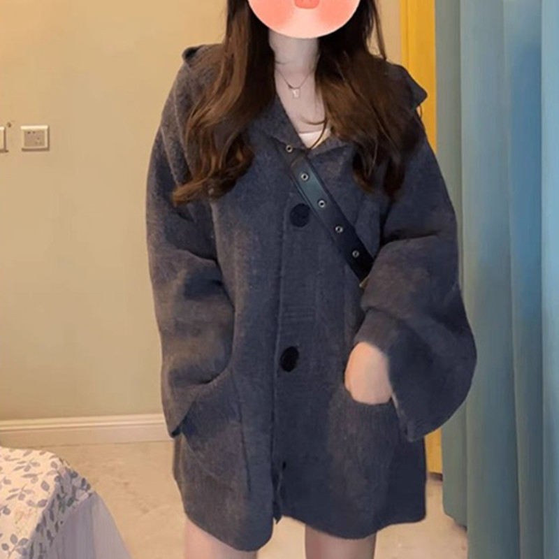 300斤灰色软糯连帽毛呢外套女秋冬季韩系氛围感针织开衫大衣胖MM2