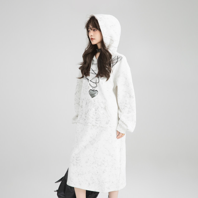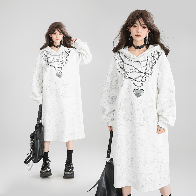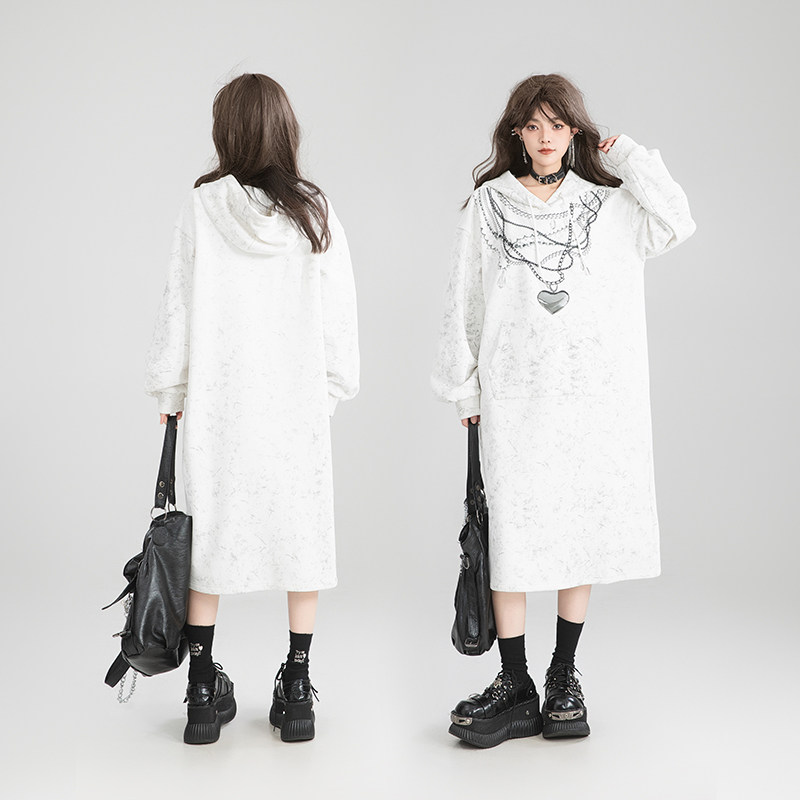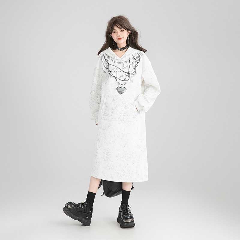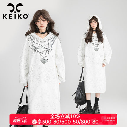KEIKO 立体感链饰印花长款卫衣裙25春法式宽松显瘦白色连帽连衣裙