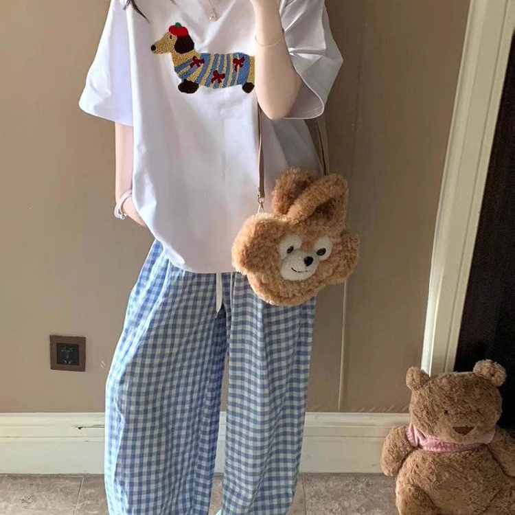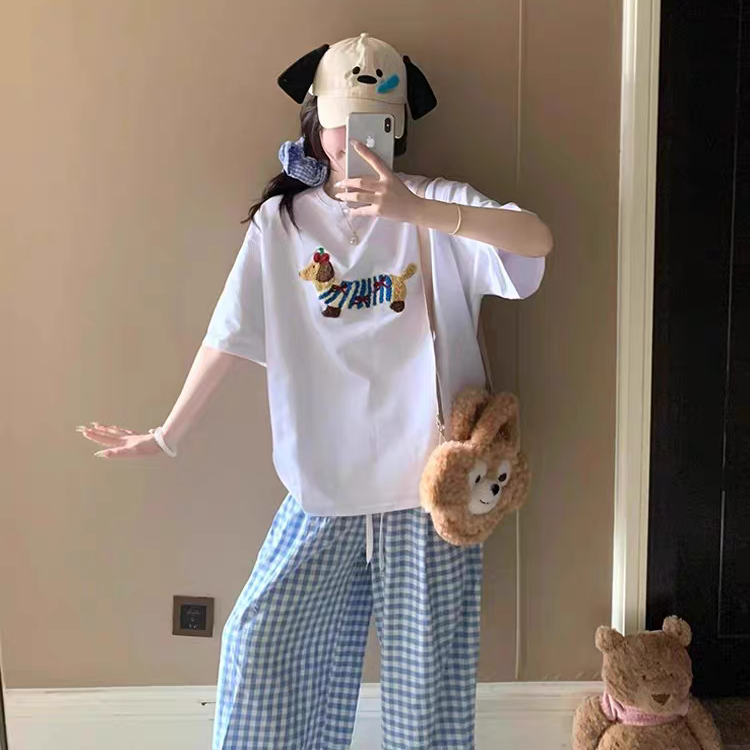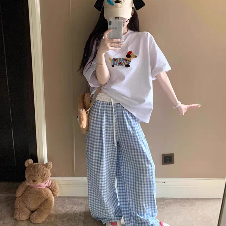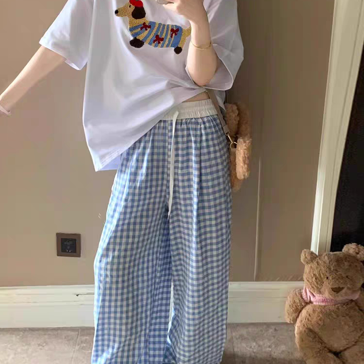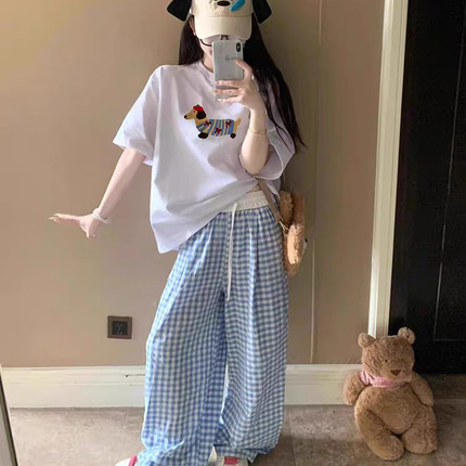 睡衣女夏季2025年新款纯棉短袖格子长裤可外穿学生卡通家居服套装
