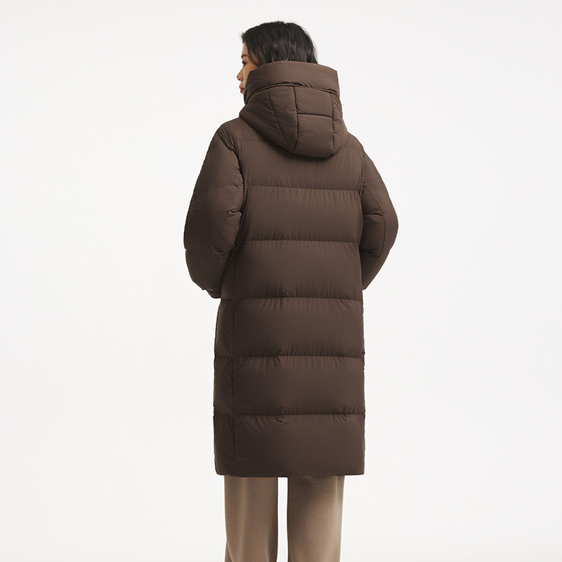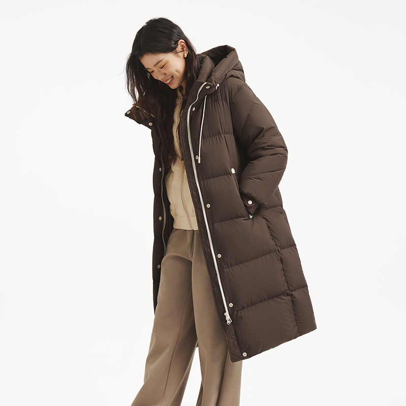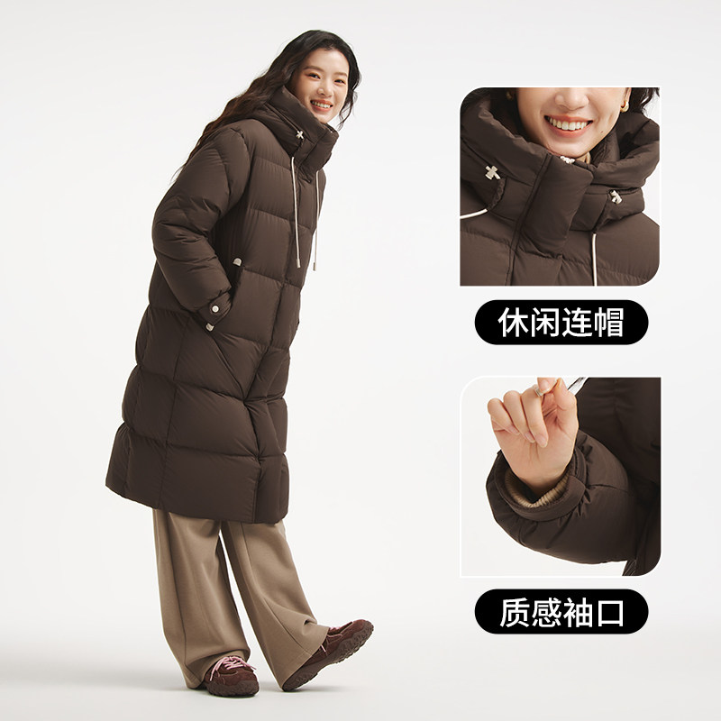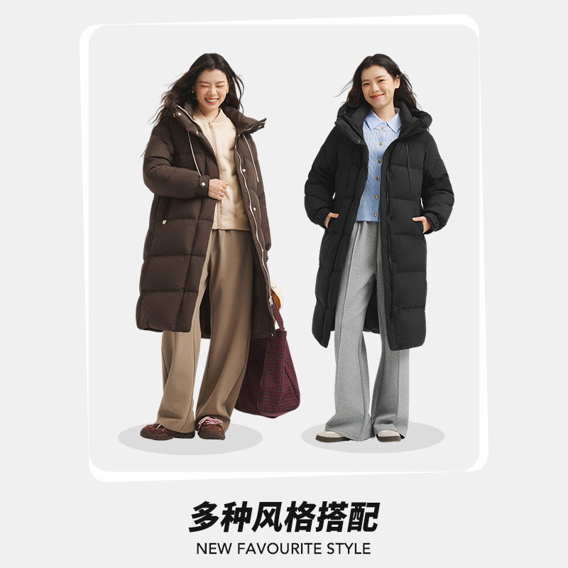 热风女士羽绒服中长款连帽羽绒服2025年冬季新款时尚保暖蓬松羽绒