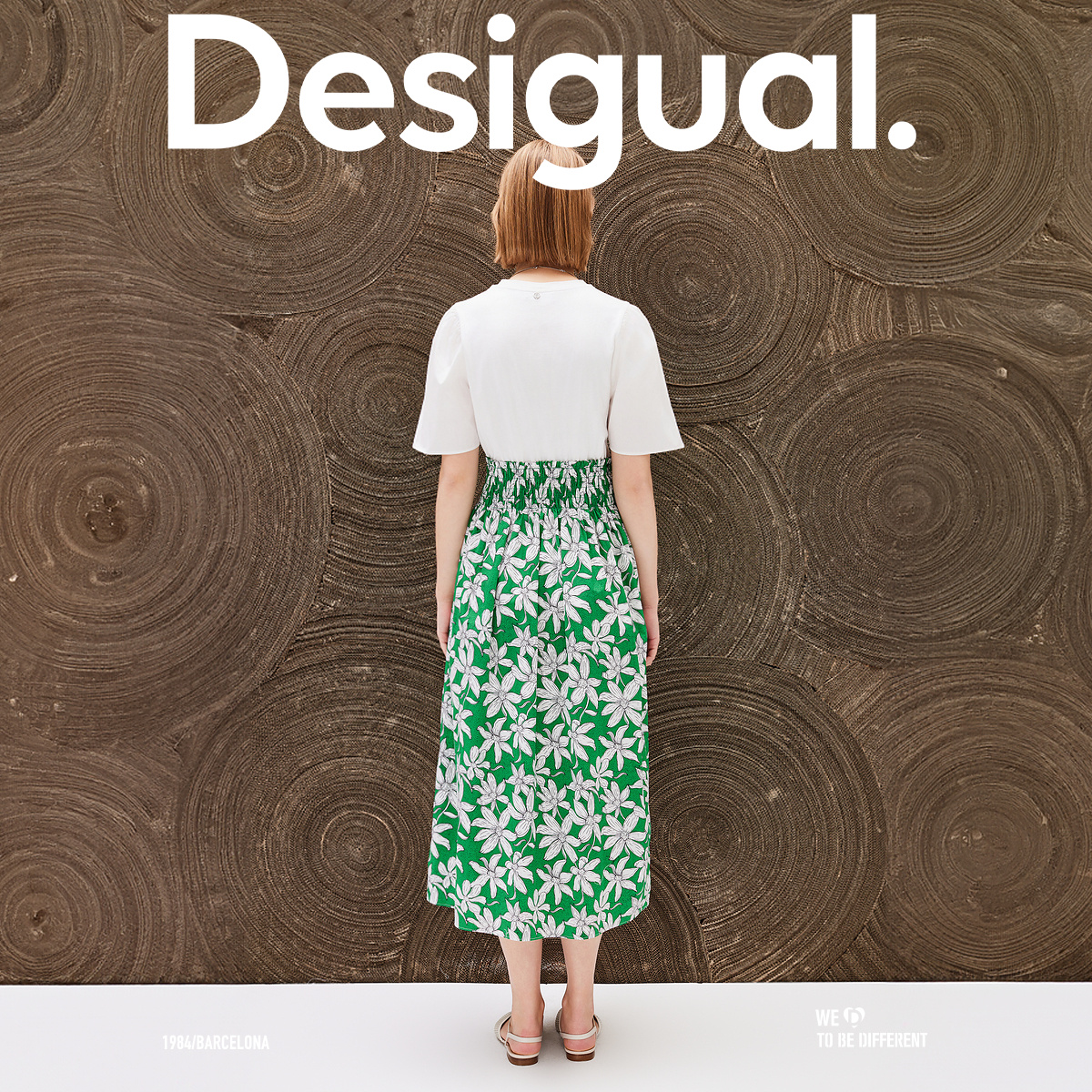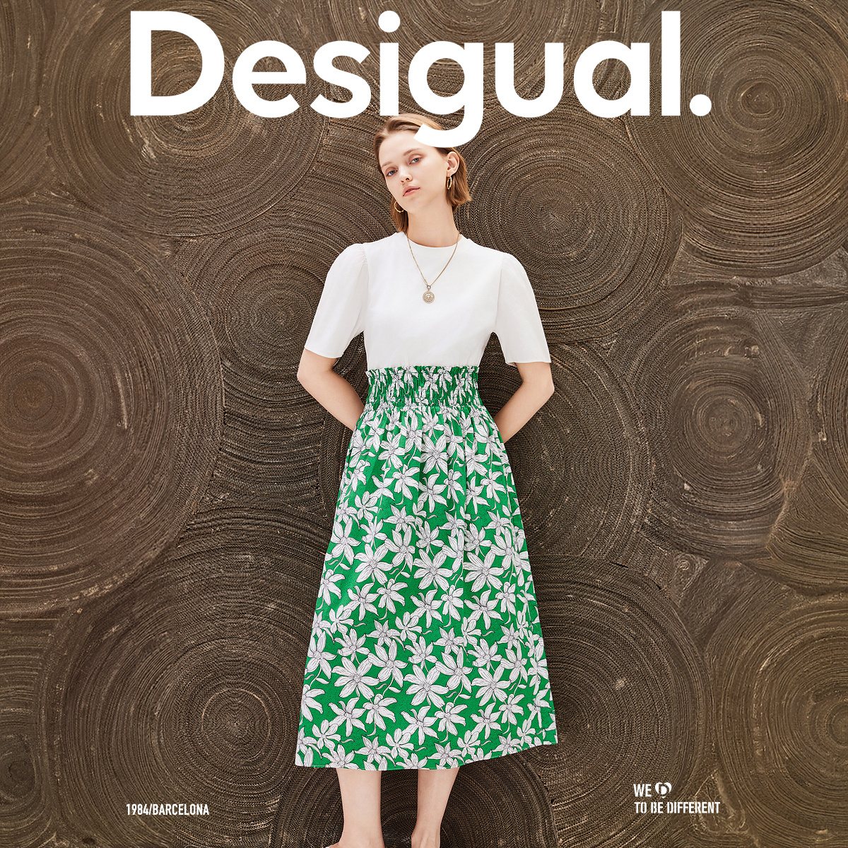 Desigual高腰拼接橡筋收腰印花圆领薄荷曼波连衣裙长裙