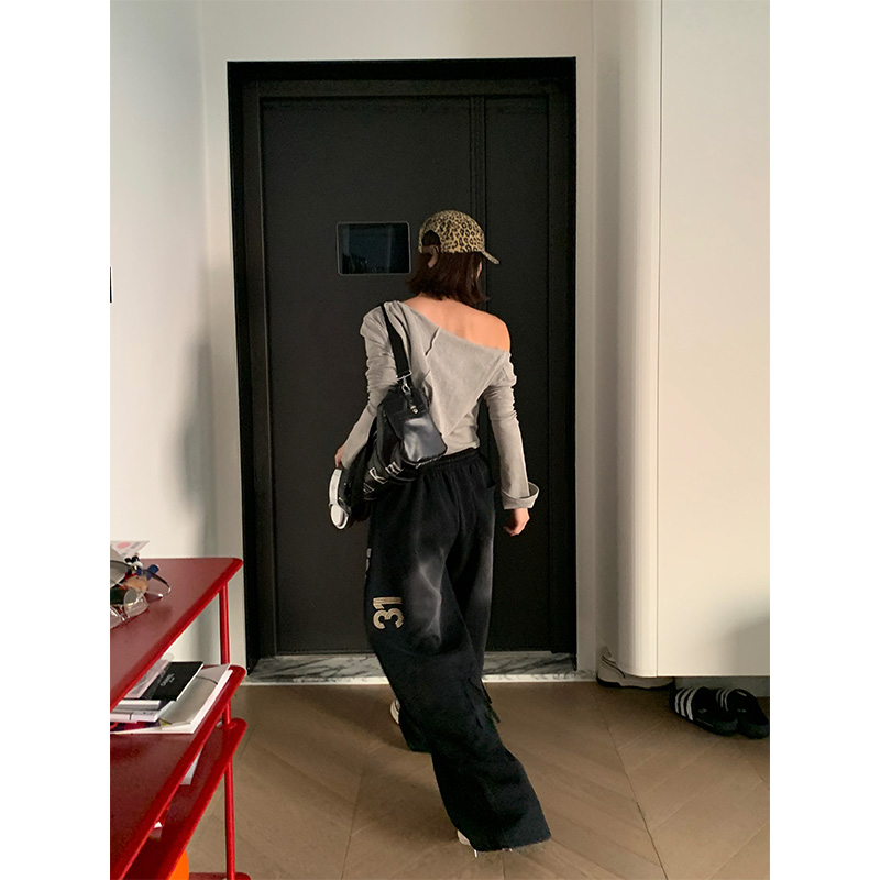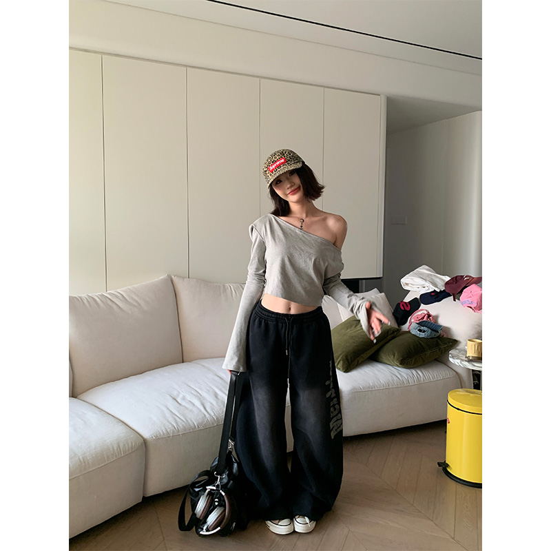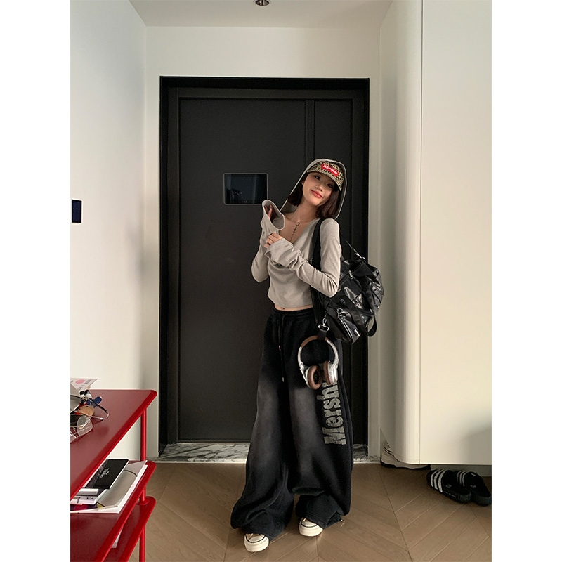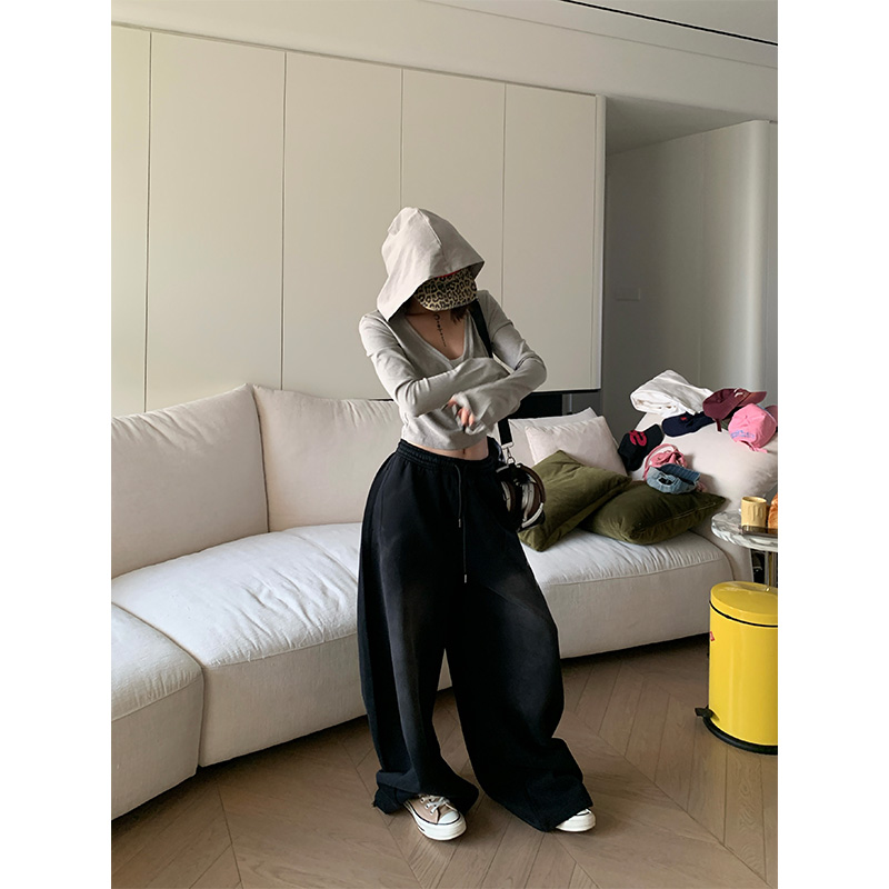 JMJ 美式长袖连帽宽松T恤女辣妹夏季慵懒感性感短款基础百搭上衣