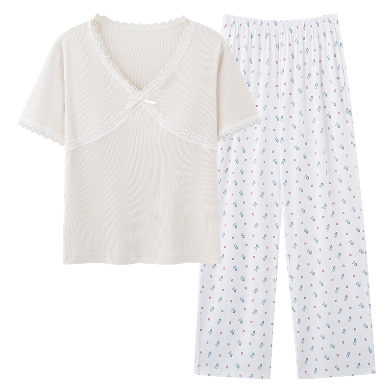 猫人冰丝睡衣女士夏季短袖长裤2025新款简约凉感带胸垫家居服套装
