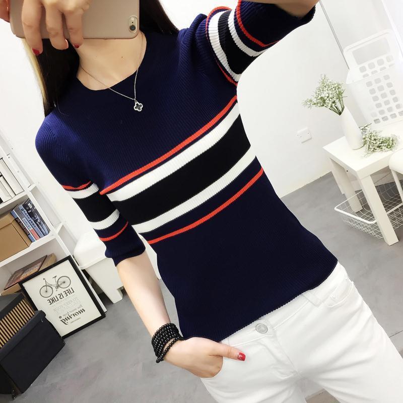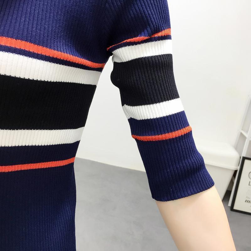 春秋新款条纹中袖针织衫女短款毛衣打底修身上衣T恤修身长袖指环