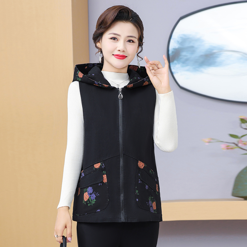 妈妈装春秋薄款全棉牛仔马甲中老年女装大码宽松连帽外套纯棉马夹