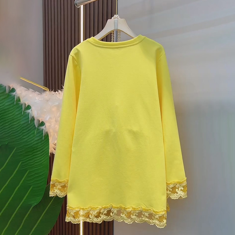 胖MM300斤加大码纯色简约风春秋女款百搭长袖上衣中长款蕾丝T恤衫